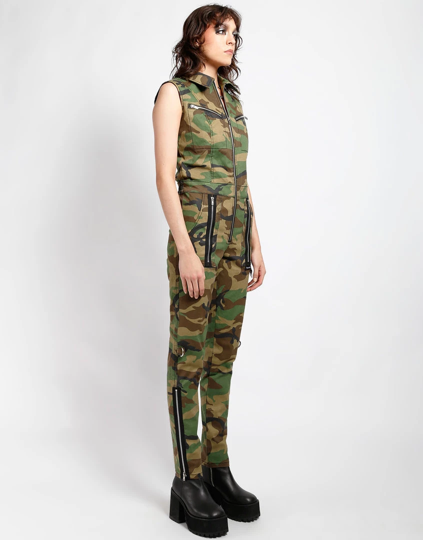 Fulfill your style potential with this slick utilitarian jumpsuit featuring a gunmetal zipper closure and details, a cinched waist, and deep pockets.