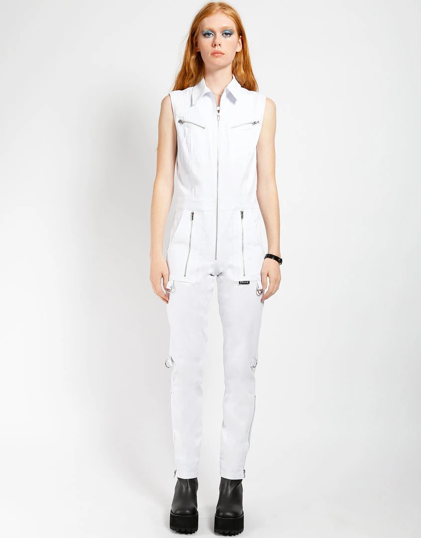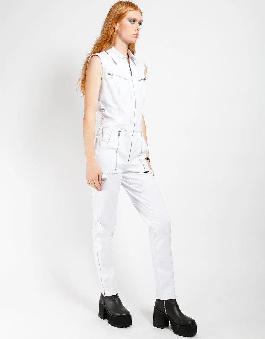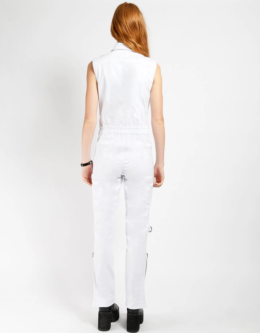 Fulfill your style potential with this slick utilitarian jumpsuit featuring a gunmetal zipper closure and details, a cinched waist, and deep pockets.