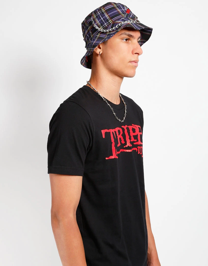 Purple plaid bucket hat with a chain and buckle bondage strap.