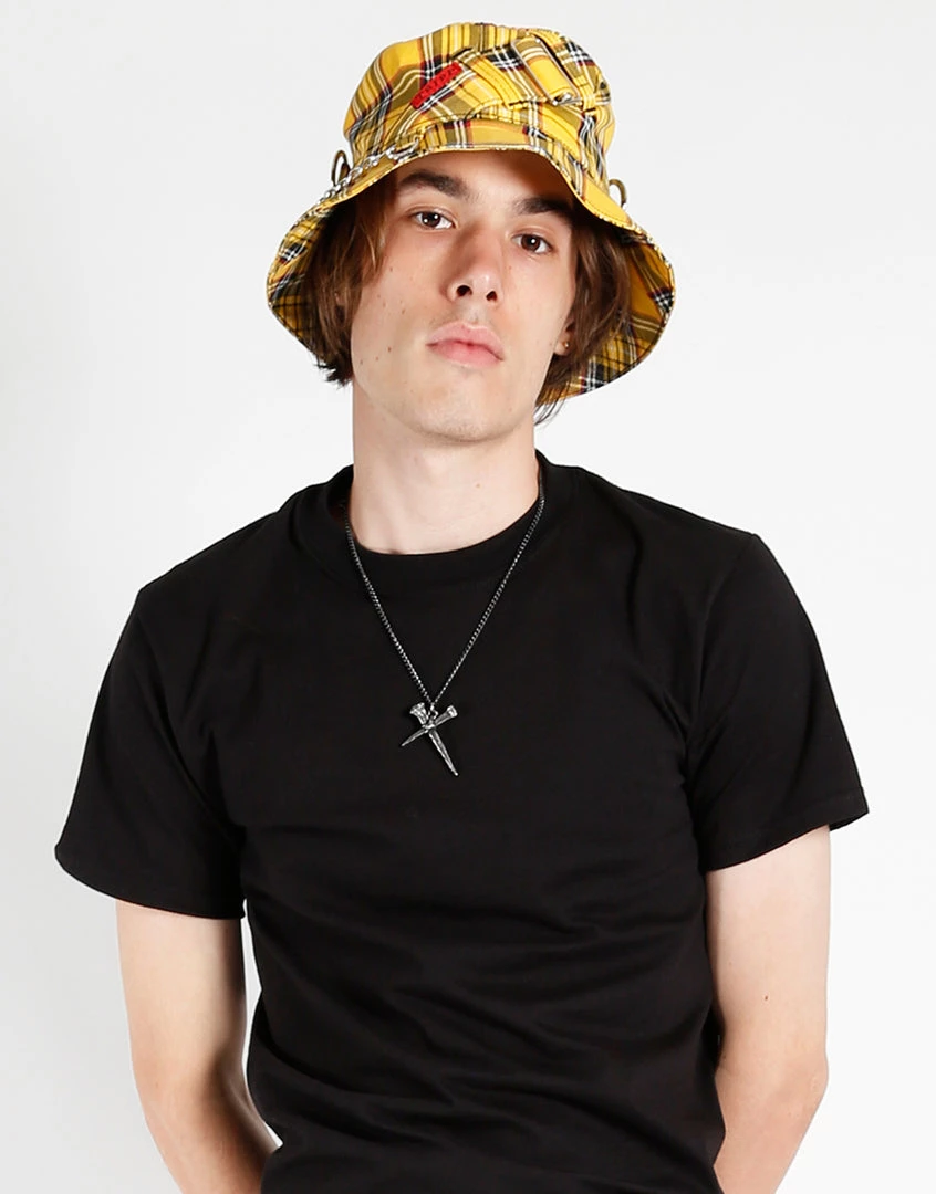 Yellow plaid bucket hat with a chain and buckle bondage strap.