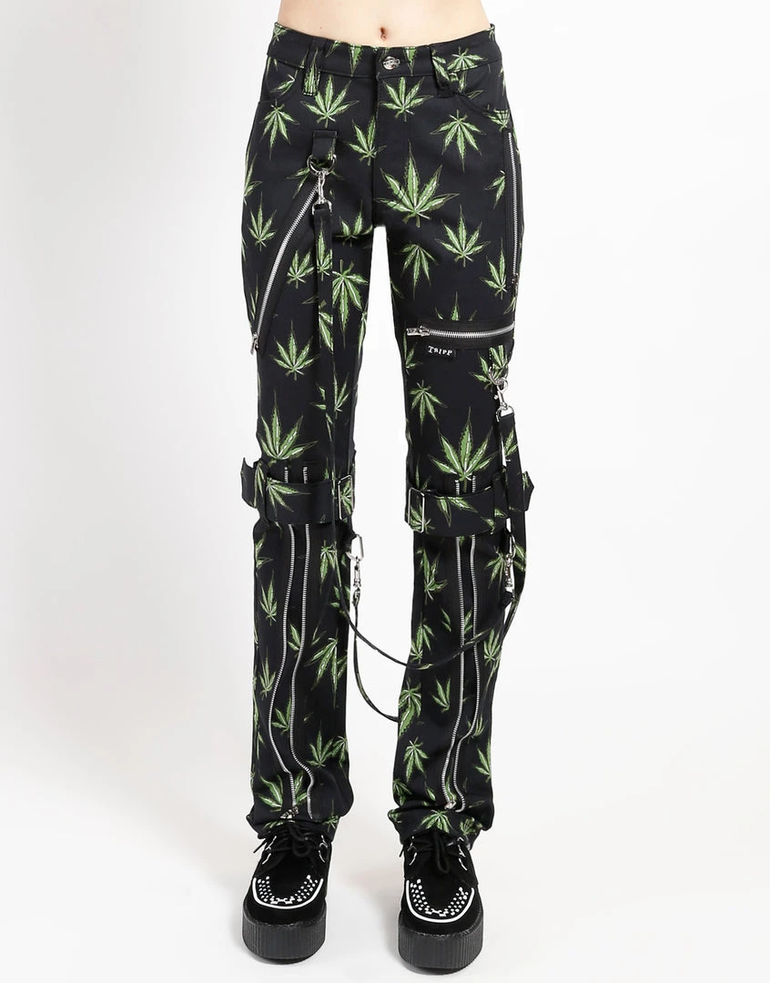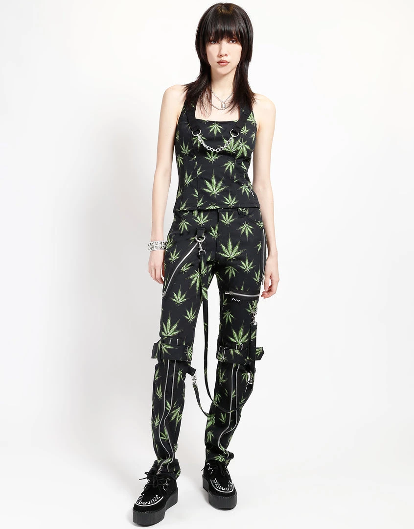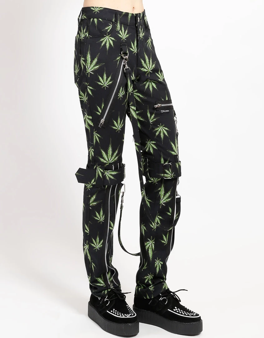 Our classic bondage pants featuring grass print, removable bondage straps and zipper details. Pant legs can be zipped for a change in fit, topped off with a zip fly and button closure.