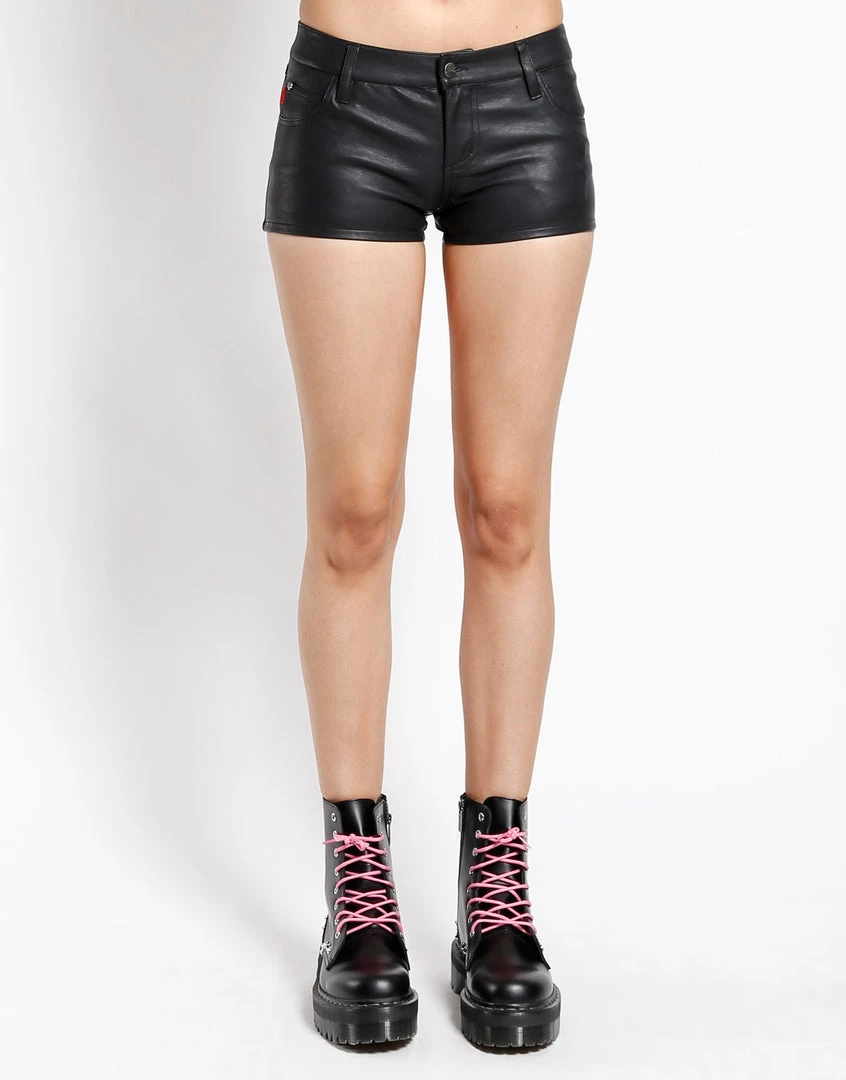 Show off those pretty pins in these lil vegan leather short shorts! Your bum will thank you! These teeny tiny shorts are low rise, with five-pocket detail and skull rivets.
