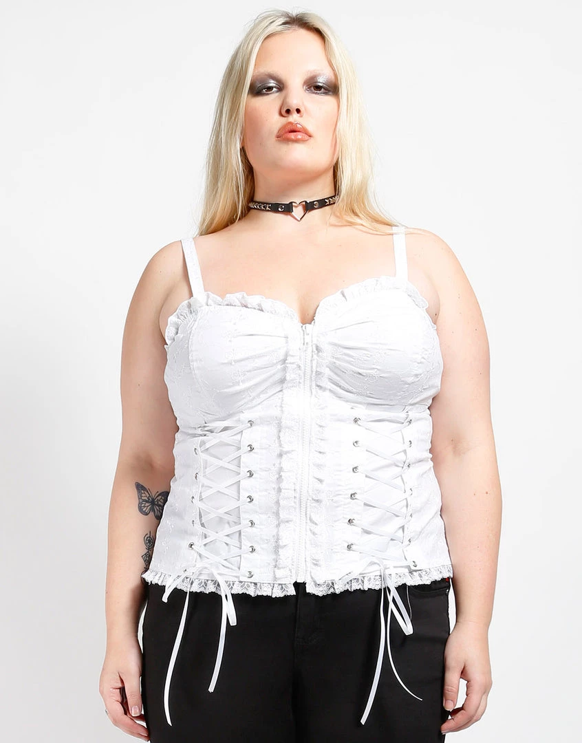 Don’t let the ruffles fool ya – this corset is for the good girl gone bad! Embroidered skull detail and corset lacing at the front toughen up the ruffle detailing along the sweetheart neckline, front zip closure & bottom hem.