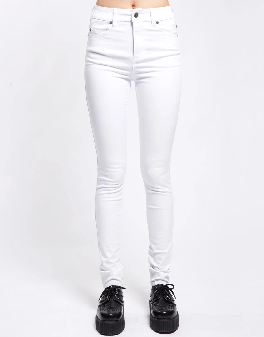 Our classic t-back taken to new heights – you’ll wear them so much one pair won’t be enough! Classic five-pocket super skinny fit with a 10 inch rise, t-back pockets, skull rivets, zip fly & button closure.