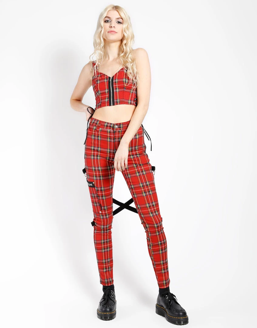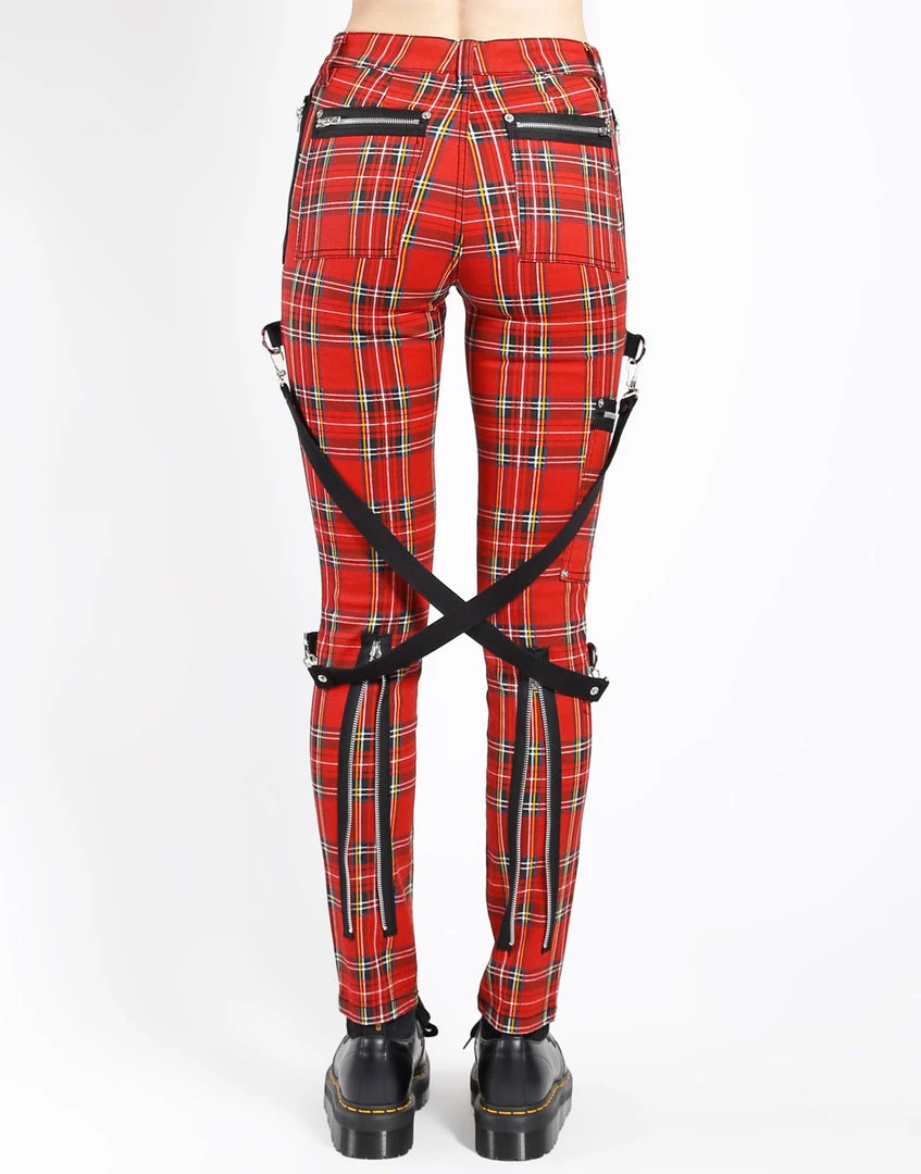 Imagine the chaos you could stir up in these printed super skinny fit pants featuring removable straps and exposed zippers! Pant legs can be zipped for a change in fit, topped off with a zip fly and button closure.