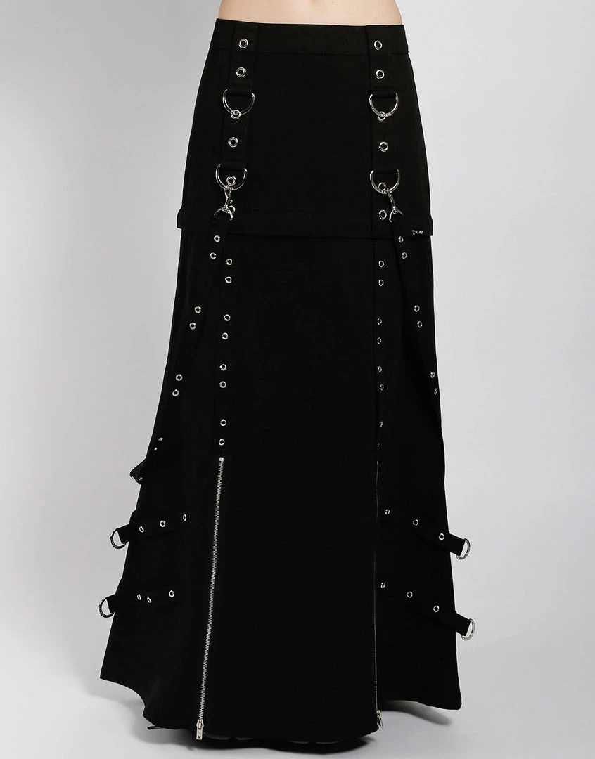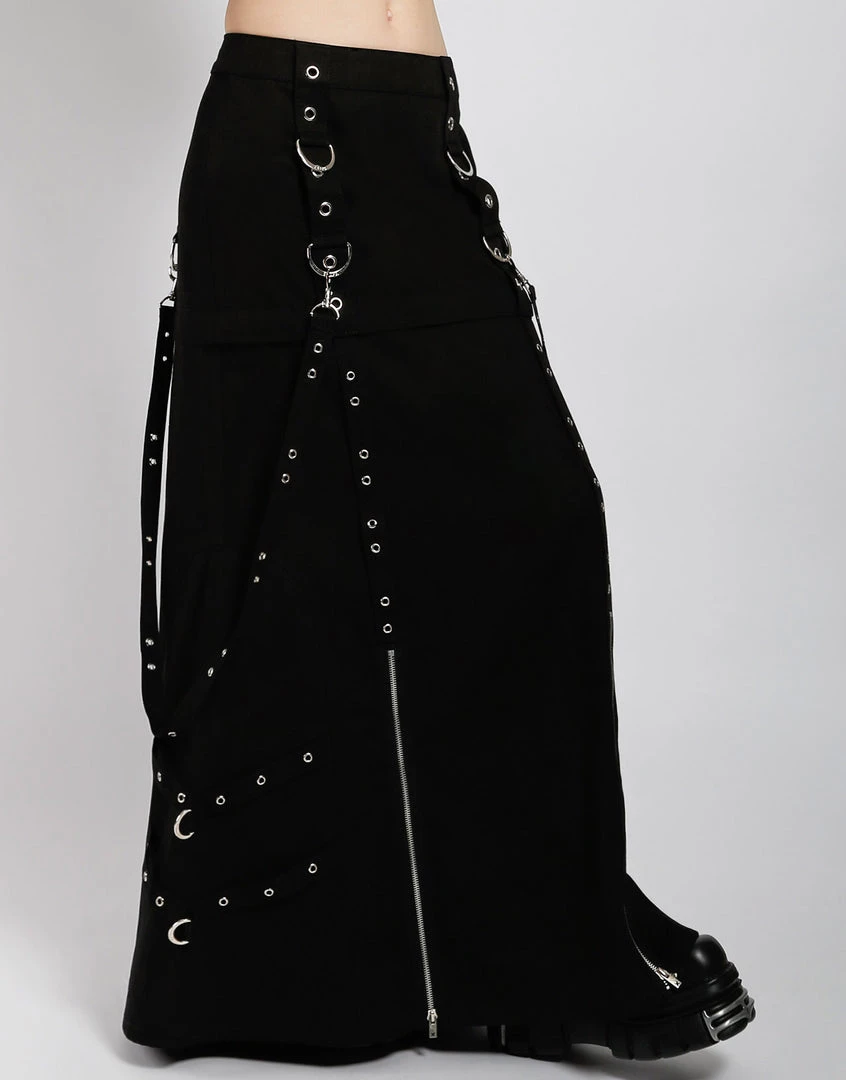 No pants, no problem! This floor length studded skirt features detachable straps, and a zippered up back.