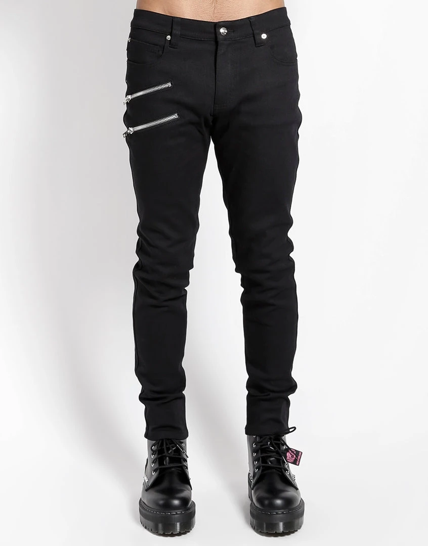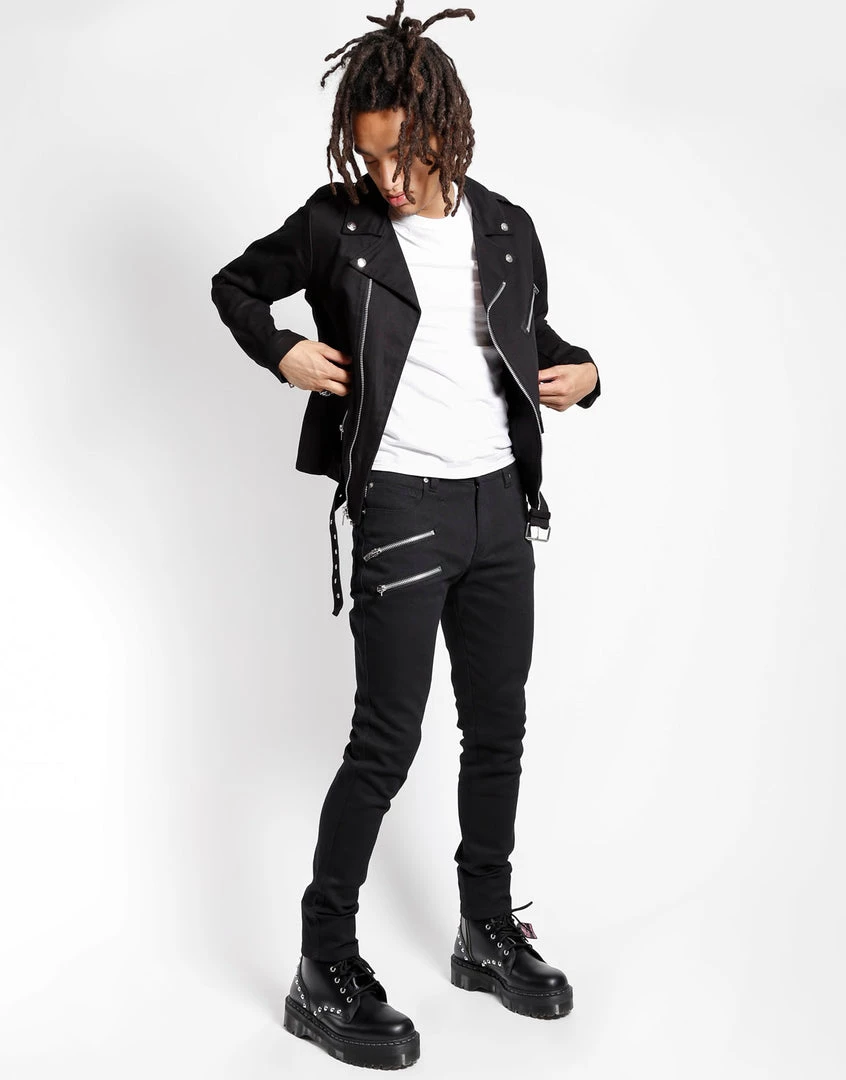 Fashion forward yet classically cool, these skinny fit biker jeans feature double zipper details, a zip and button fly, and silver rivets.