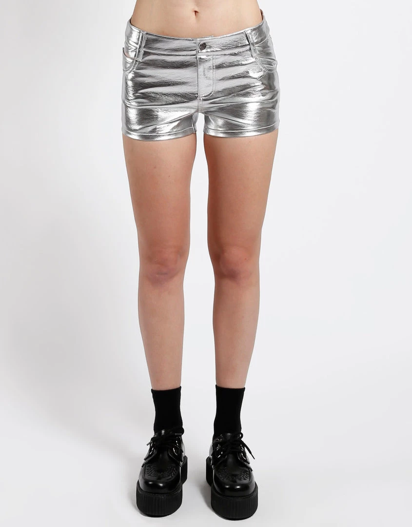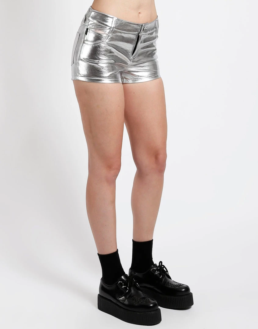 Show off those pretty pins in these lil vegan leather short shorts! Your bum will thank you! These teeny tiny shorts are low rise, with five-pocket detail and skull rivets.