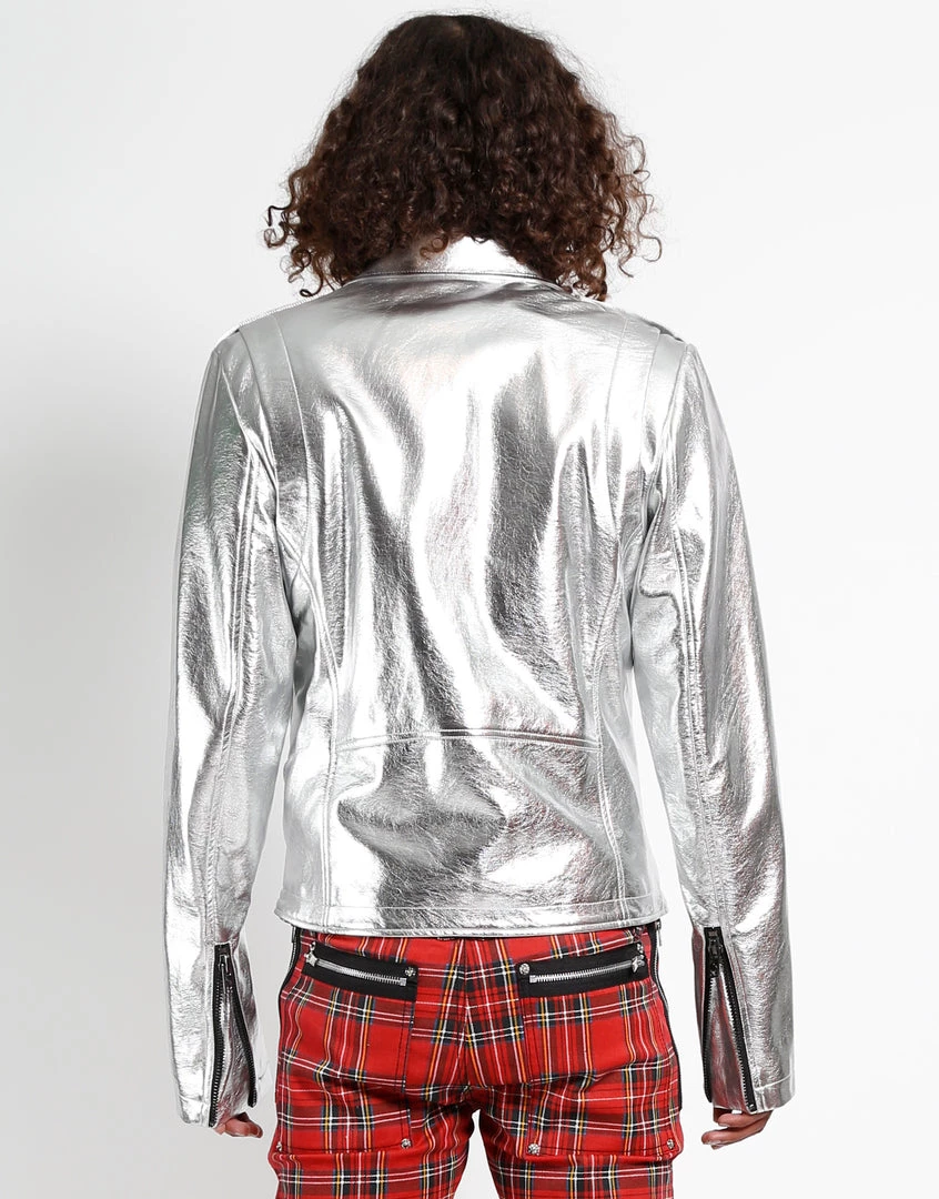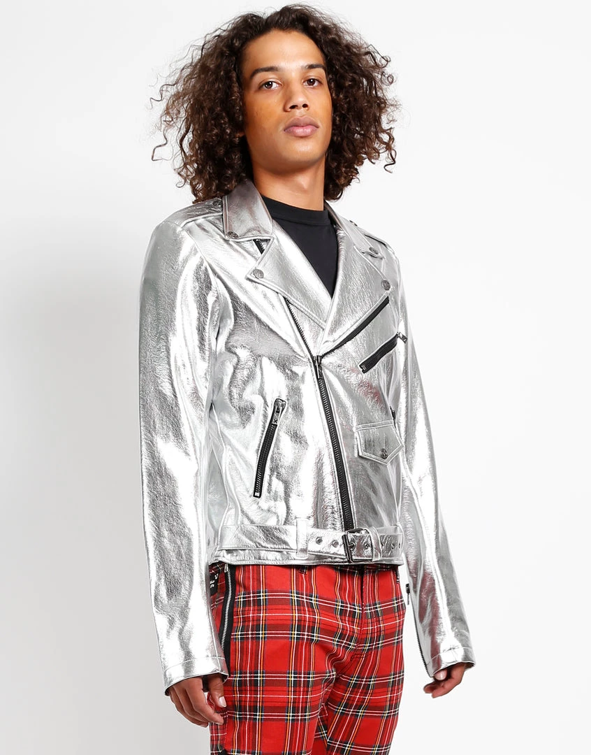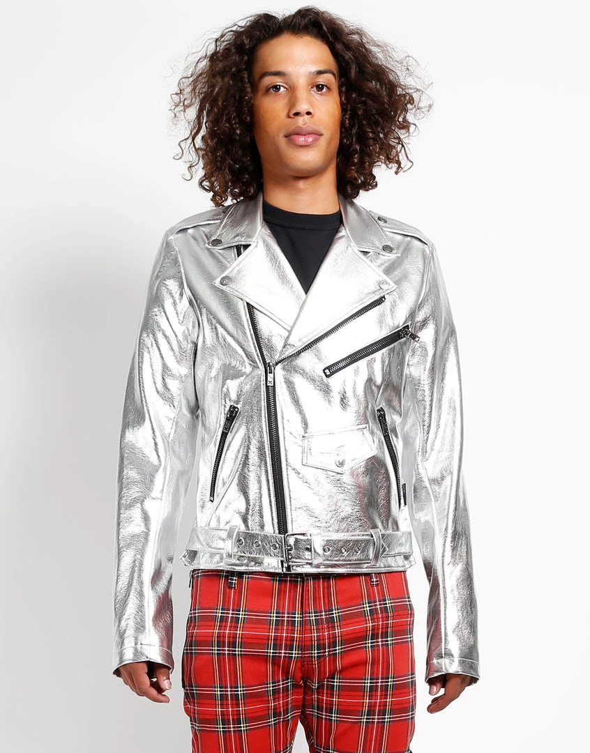 Unleash your inner biker badass in our classic motorcycle jacket in metallic vegan leather. Features four pockets, skull snaps, and a belted waist for the perfect fit.