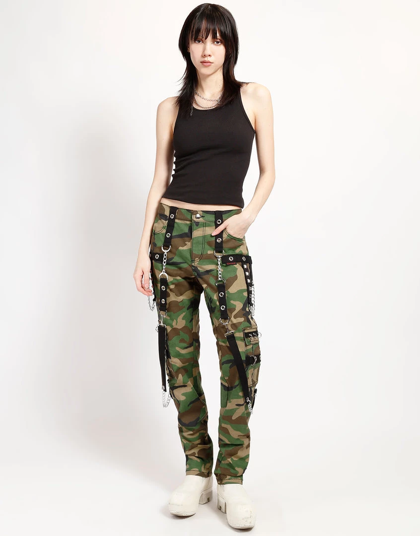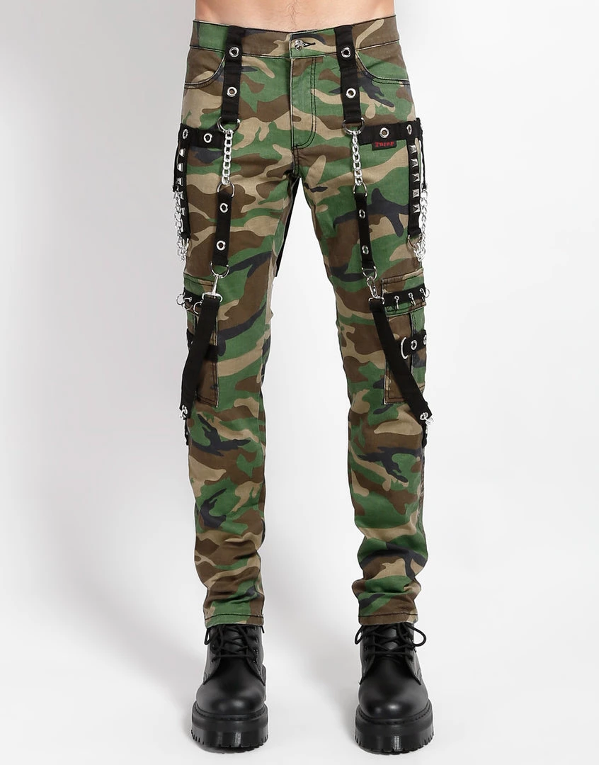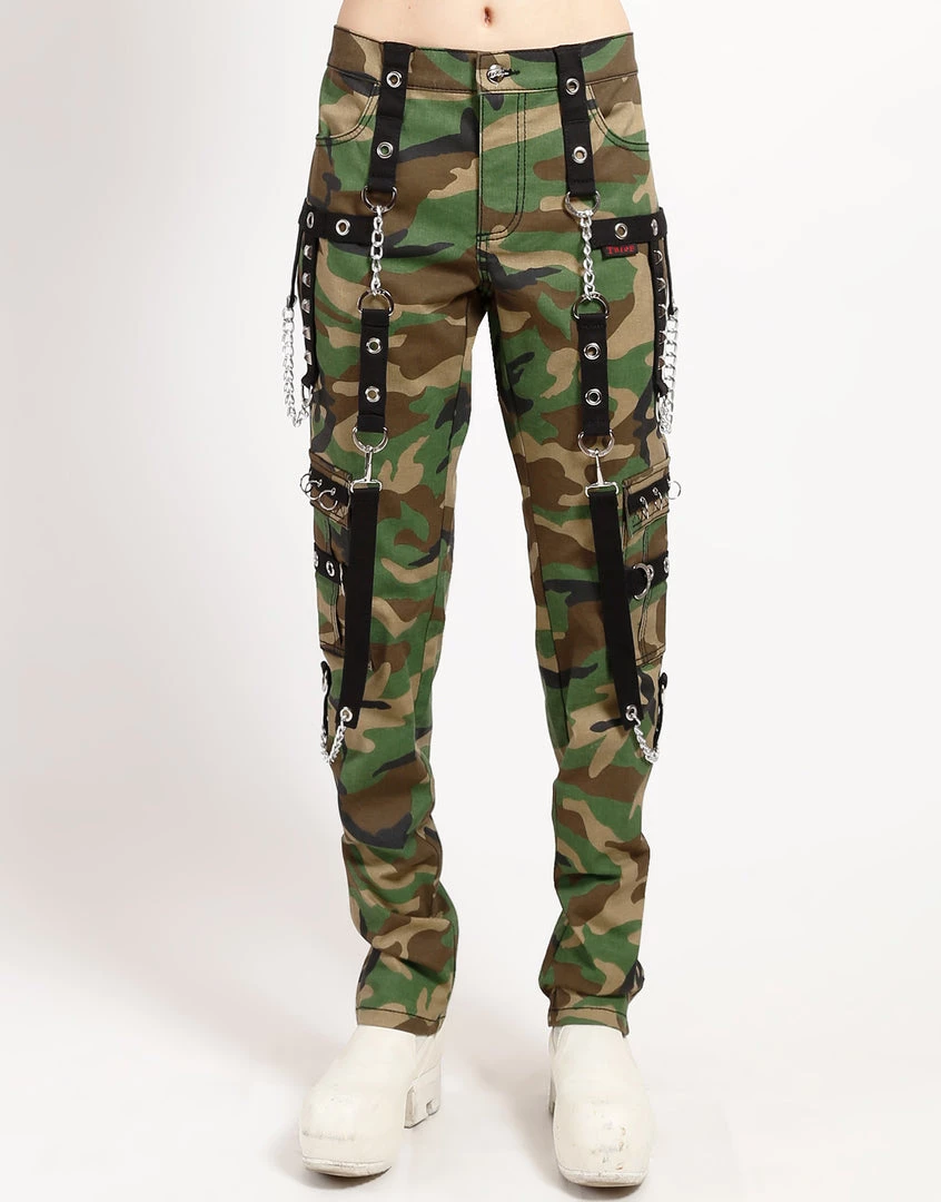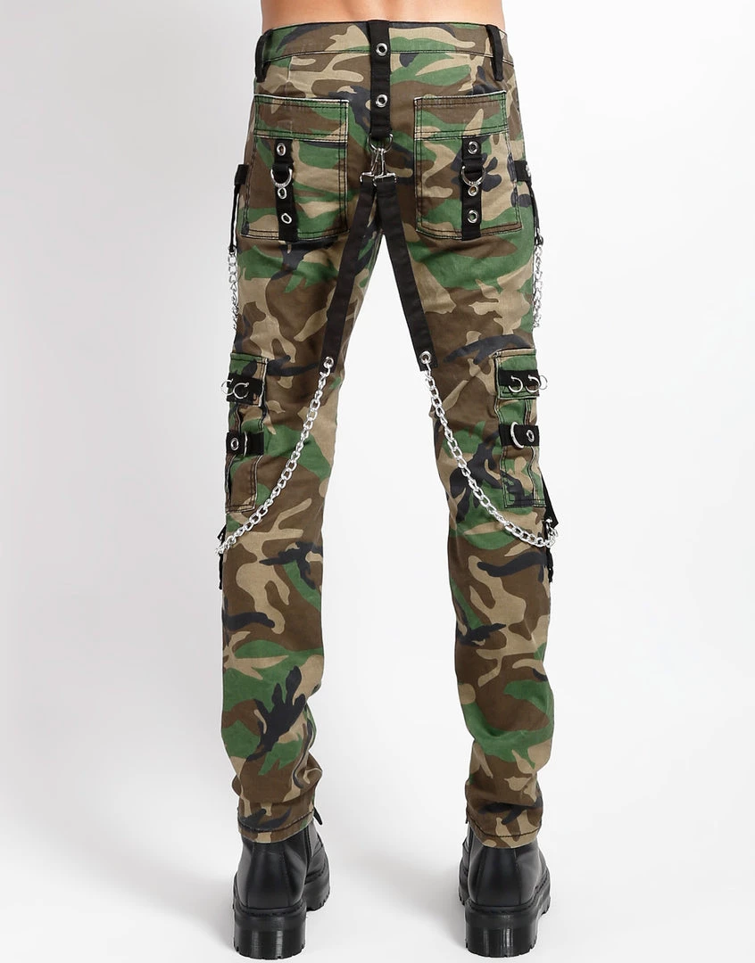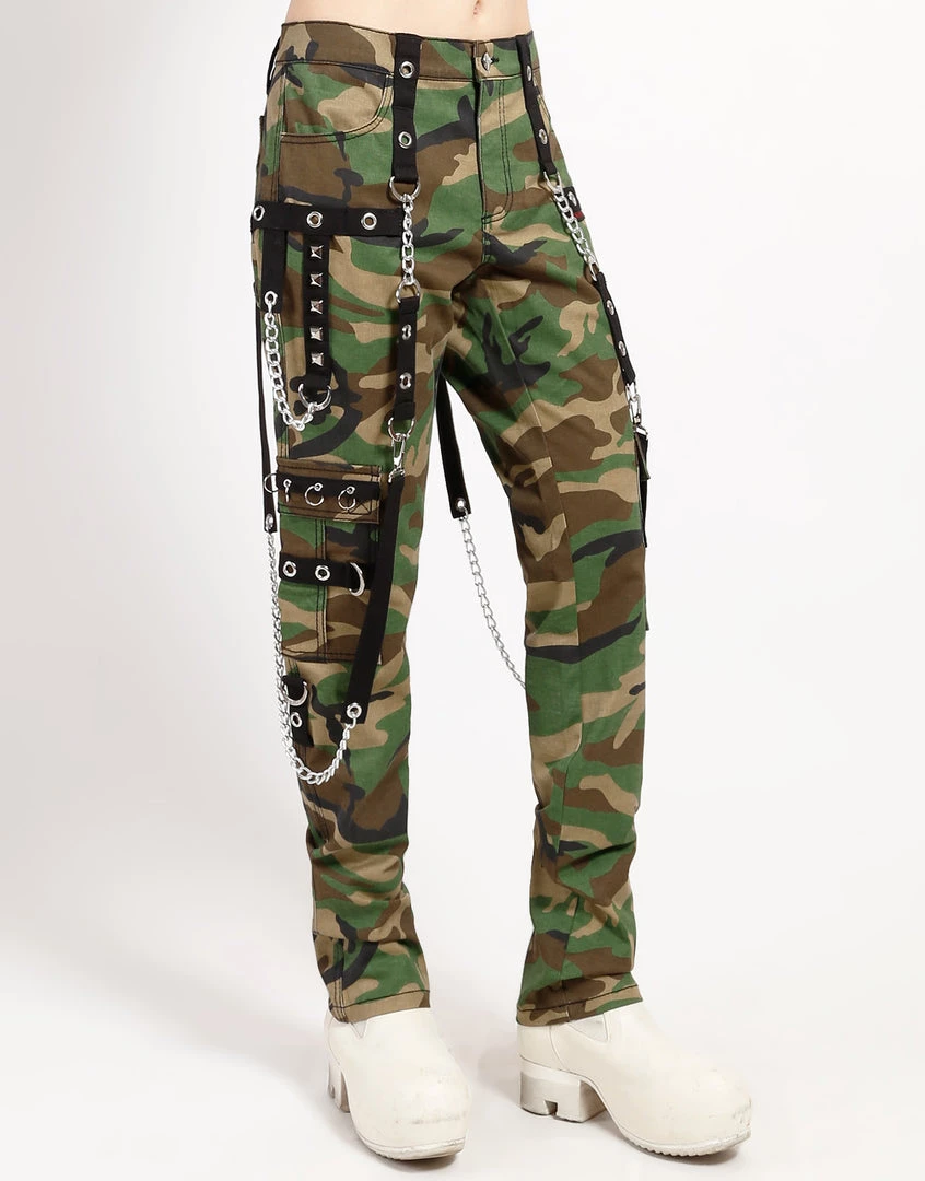 There is no excuse not to rock out in these slim fitting bondage pants featuring camo fabric, removable straps, silver chains, studs with a zipper and button closure.
