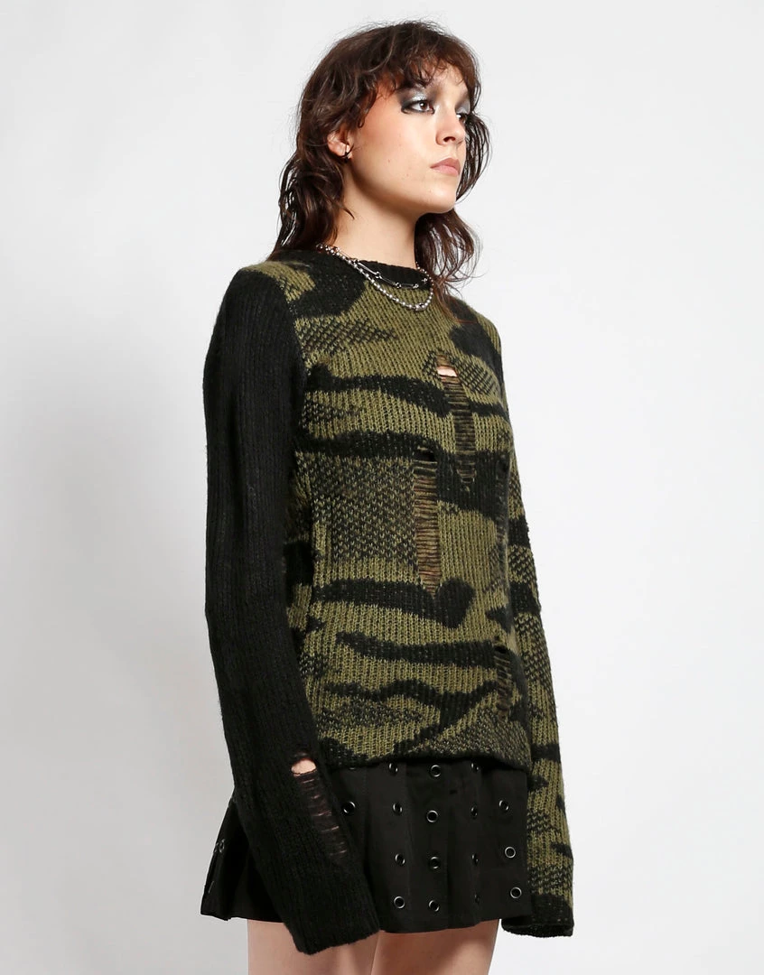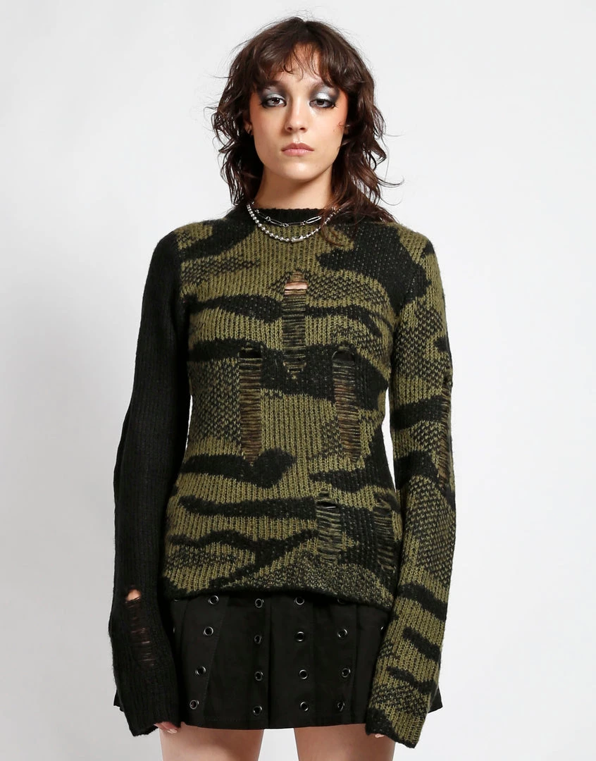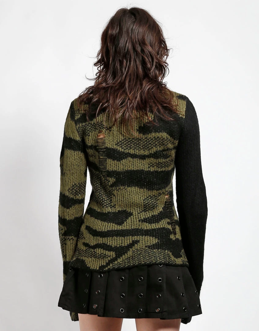 This shredded acrylic knit sweater in camo features a black sleeve, loose construction, and long sleeves which means it looks perfectly lived in before you even put it on!