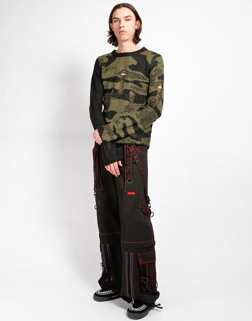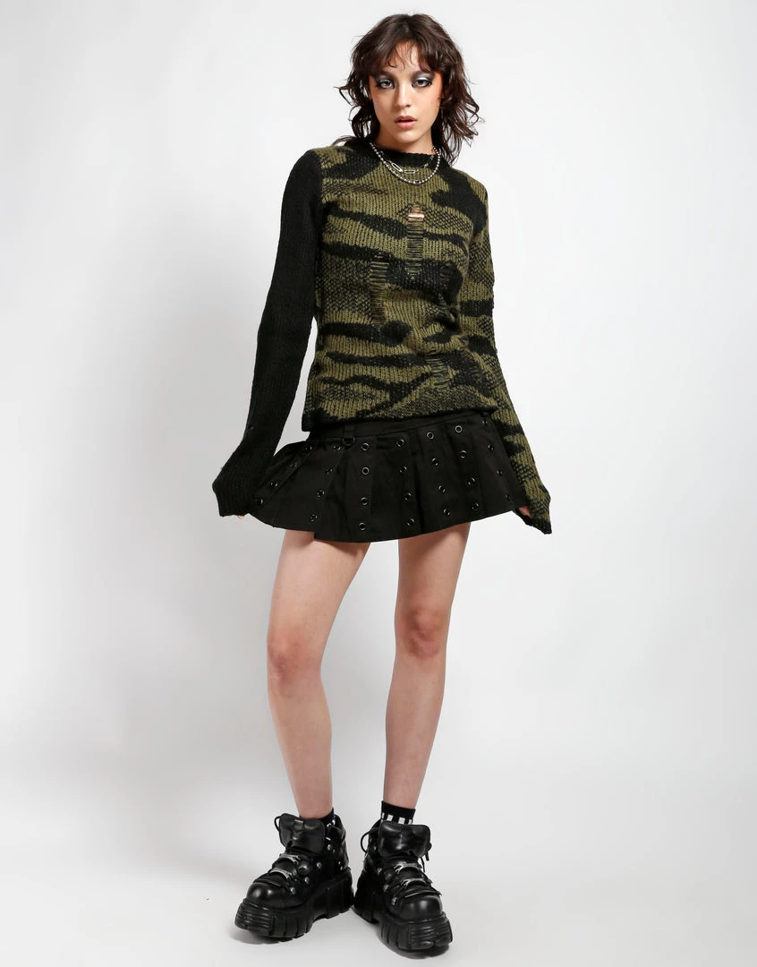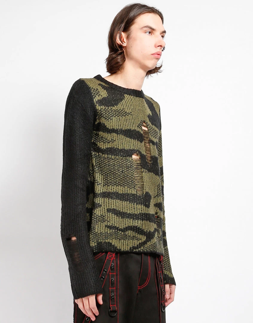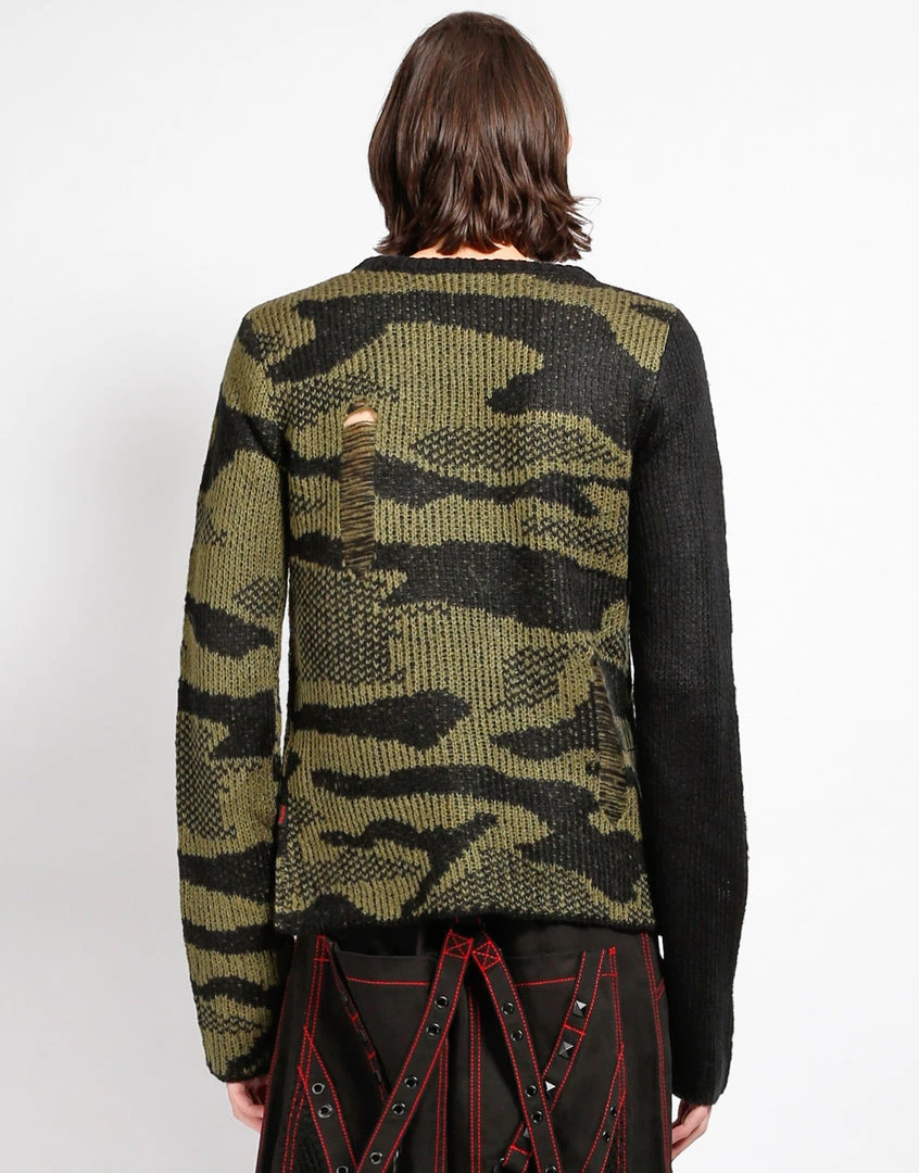 This shredded acrylic knit sweater in camo features a black sleeve, loose construction, and long sleeves which means it looks perfectly lived in before you even put it on!
