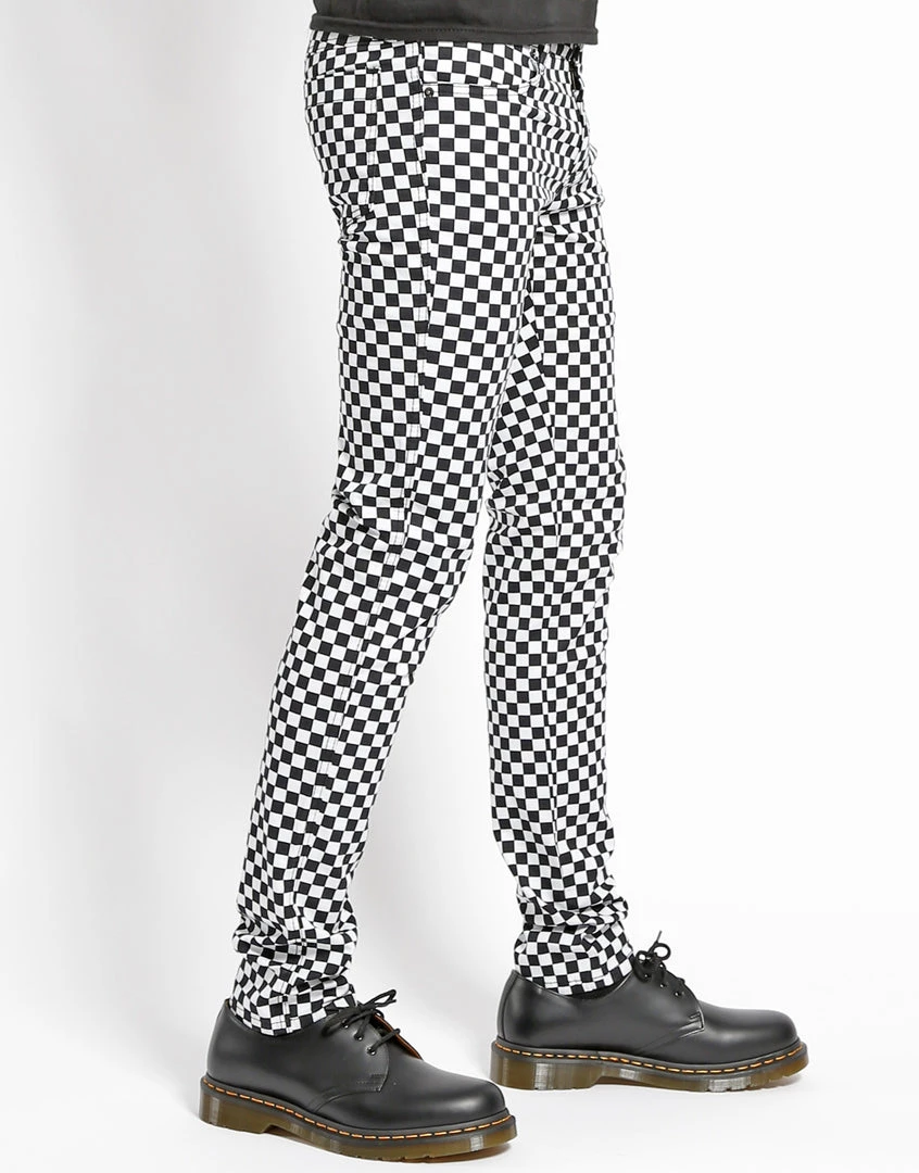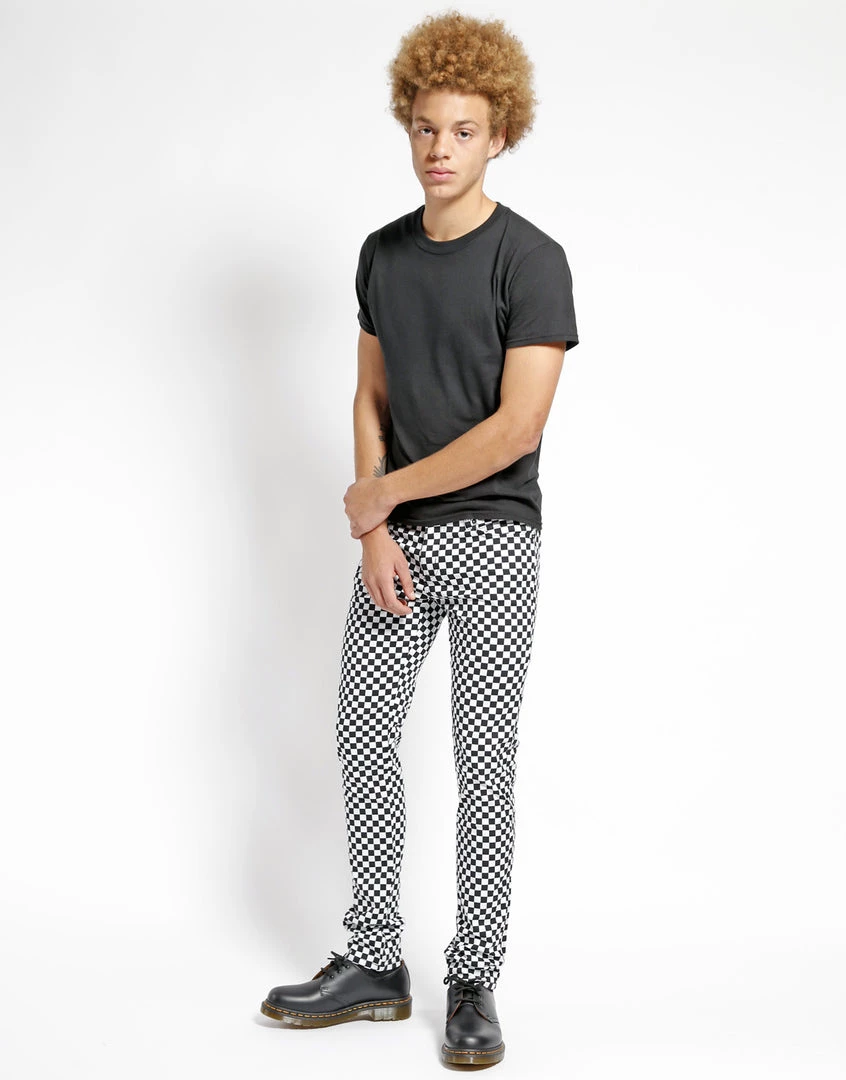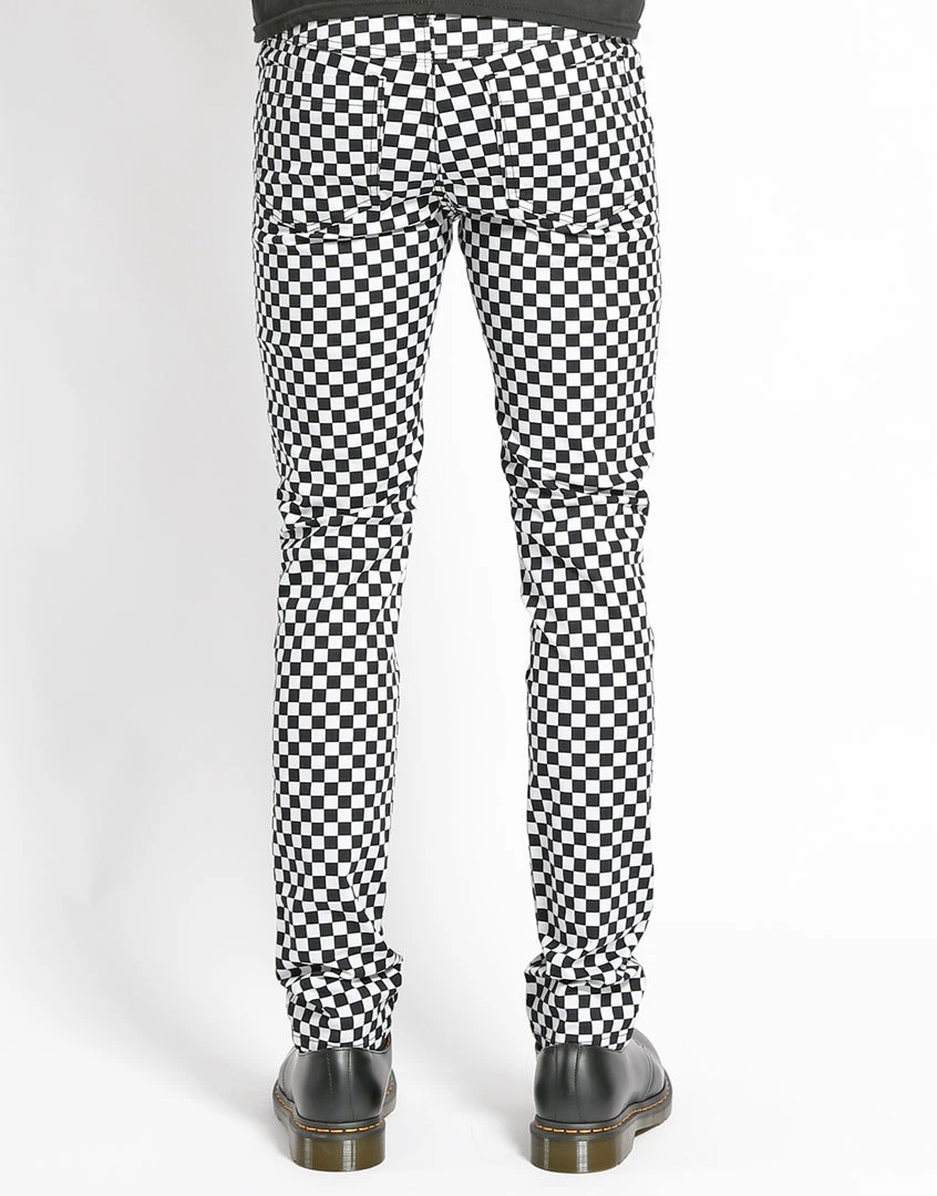 Our signature men’s skinny printed rocker jean in black and white checkerboard features classic five-pocket slim fit stretch denim with silver rivets, zip fly & button closure.