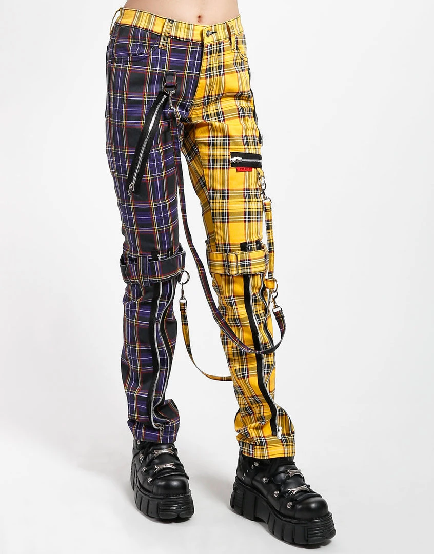 These Purple and Yellow plaid pants were made for rocking out in. A punk rock wardrobe wouldn’t be complete without our classic slim leg pants with removable bondage straps and zipper details. Pant legs can be zipped for a change in fit, topped off with a zip fly and button closure.