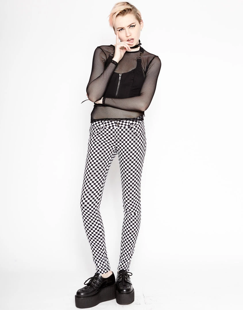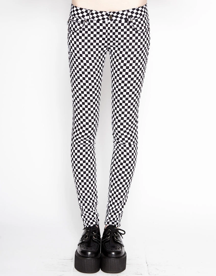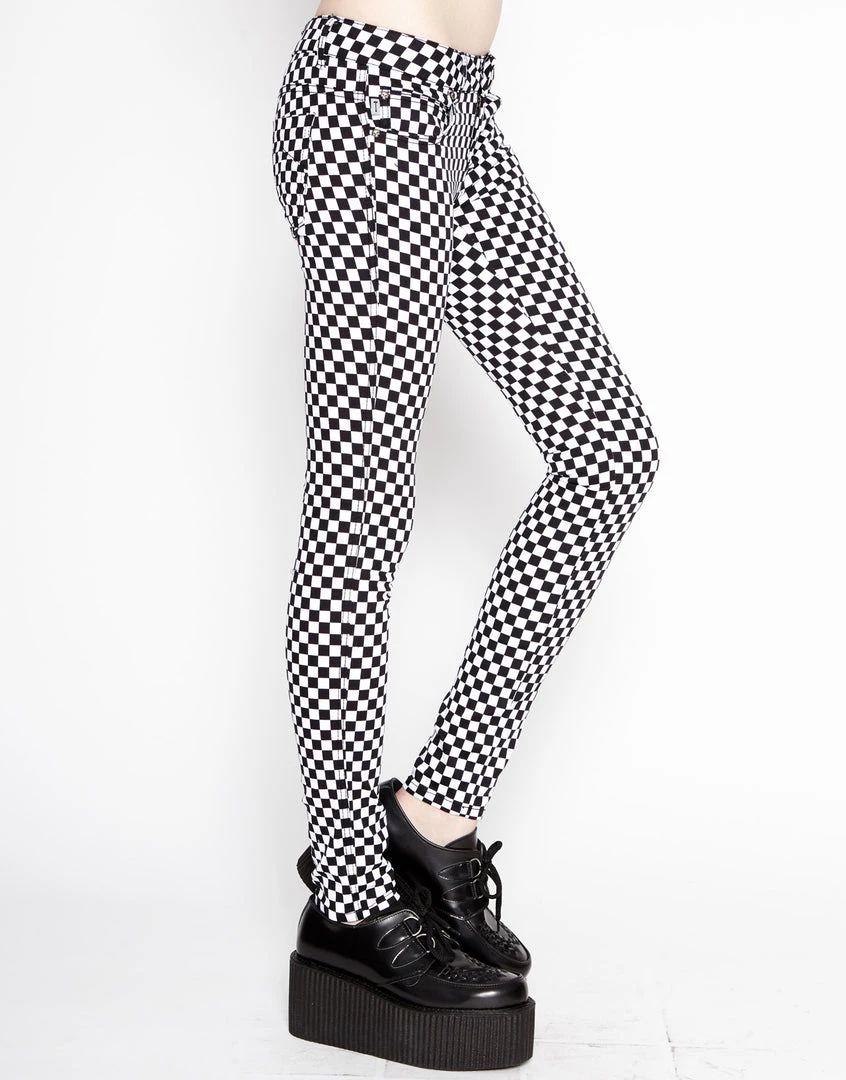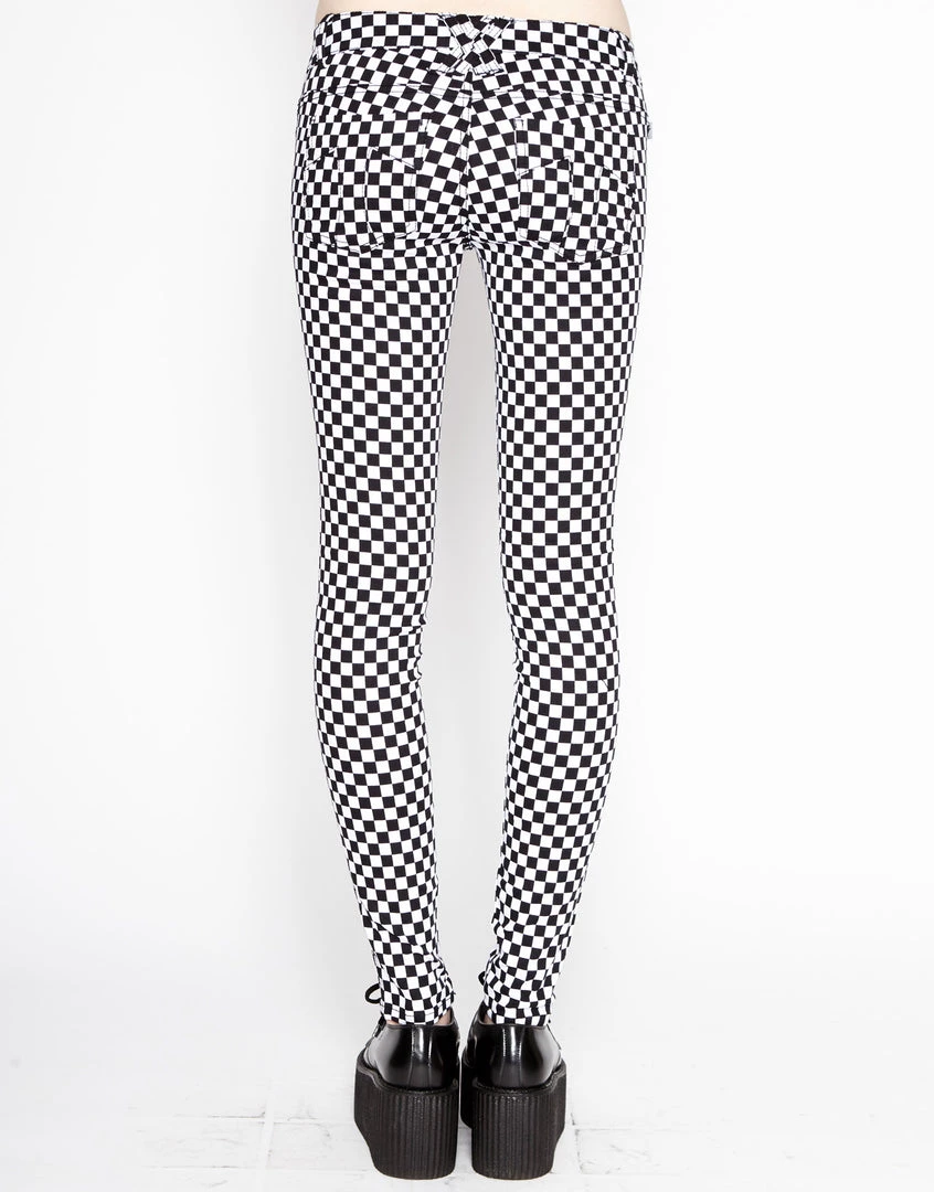 Checkmate! Classic five-pocket super skinny fit with all over checkrboard print, t-back pockets, skull rivets, zip fly & button closure.
