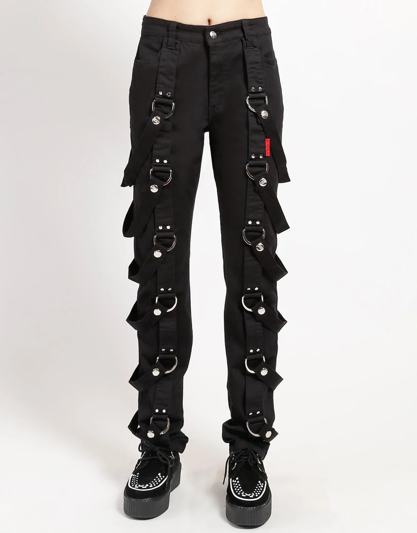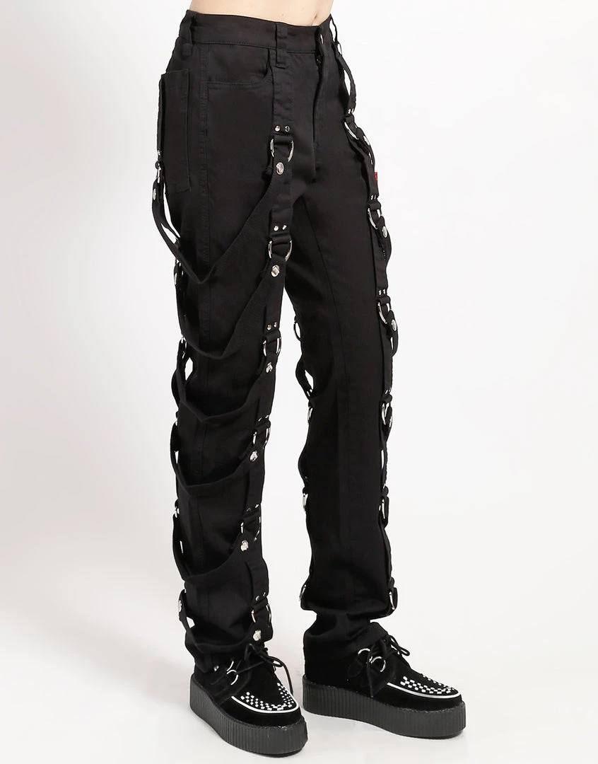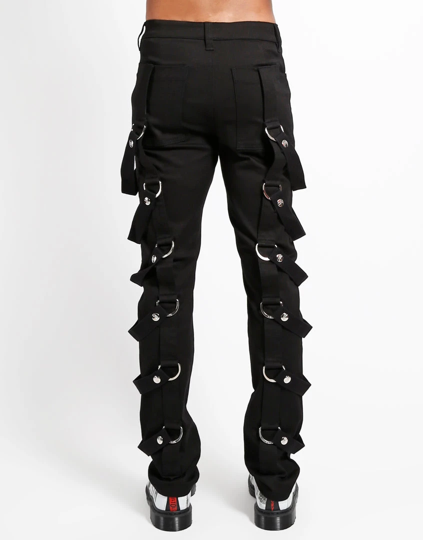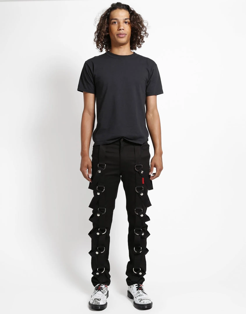 Slim 4 pocket bondage pant with d-rings, removable bondage straps and TRIPP NYC logo snap button details.