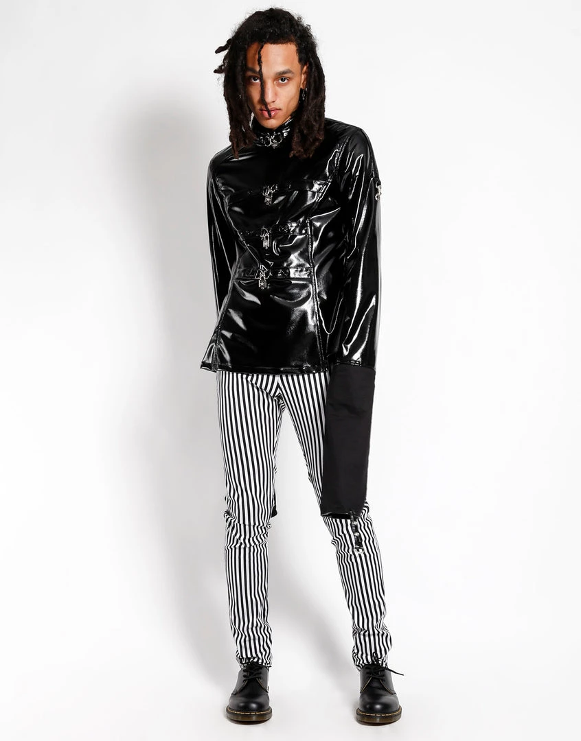 Go CRAZY in this convertible PVC straight jacket! Roll up the sleeves for everyday wear or cross and clip them for a maniacal look. Features a zipper up the back and padlocks down the front.