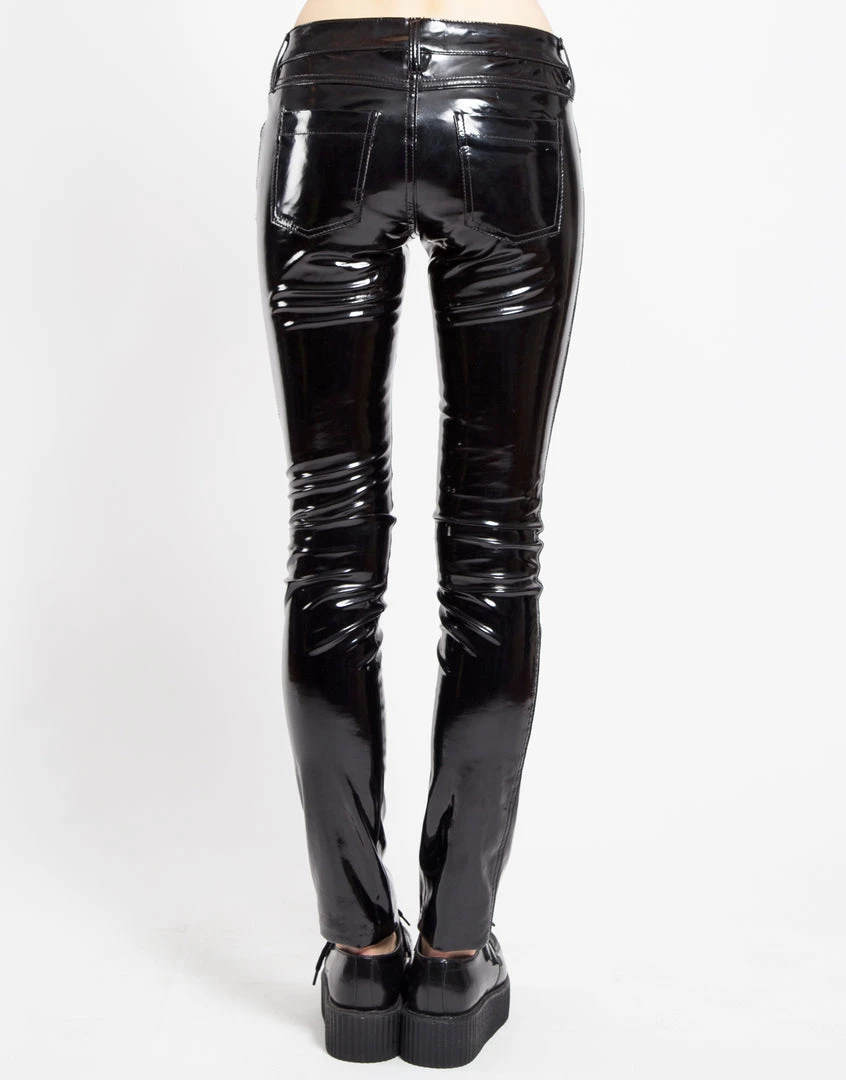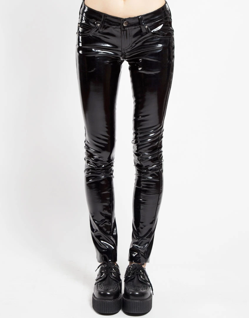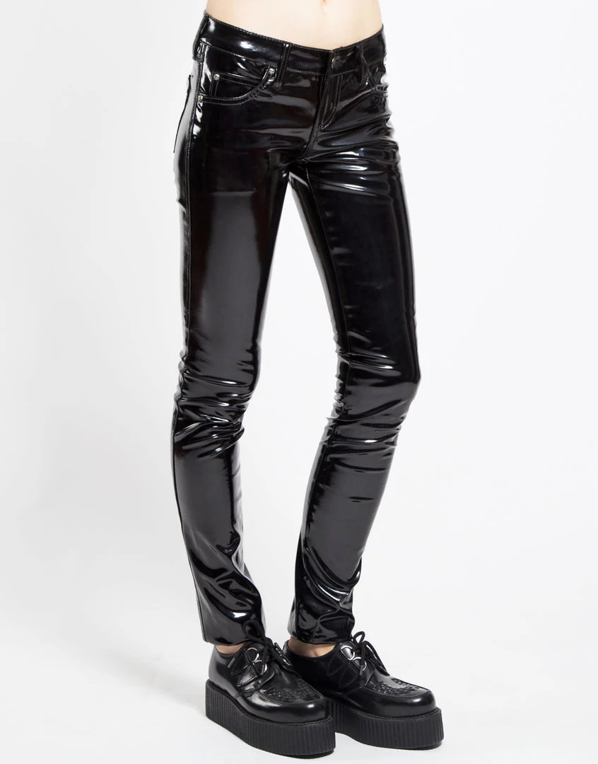 Slick and stretchy, these high-shine vinyl pants are the ultimate in rock nā roll fashion. Featuring skull rivets, zip fly and button closure.