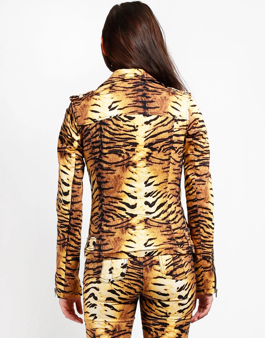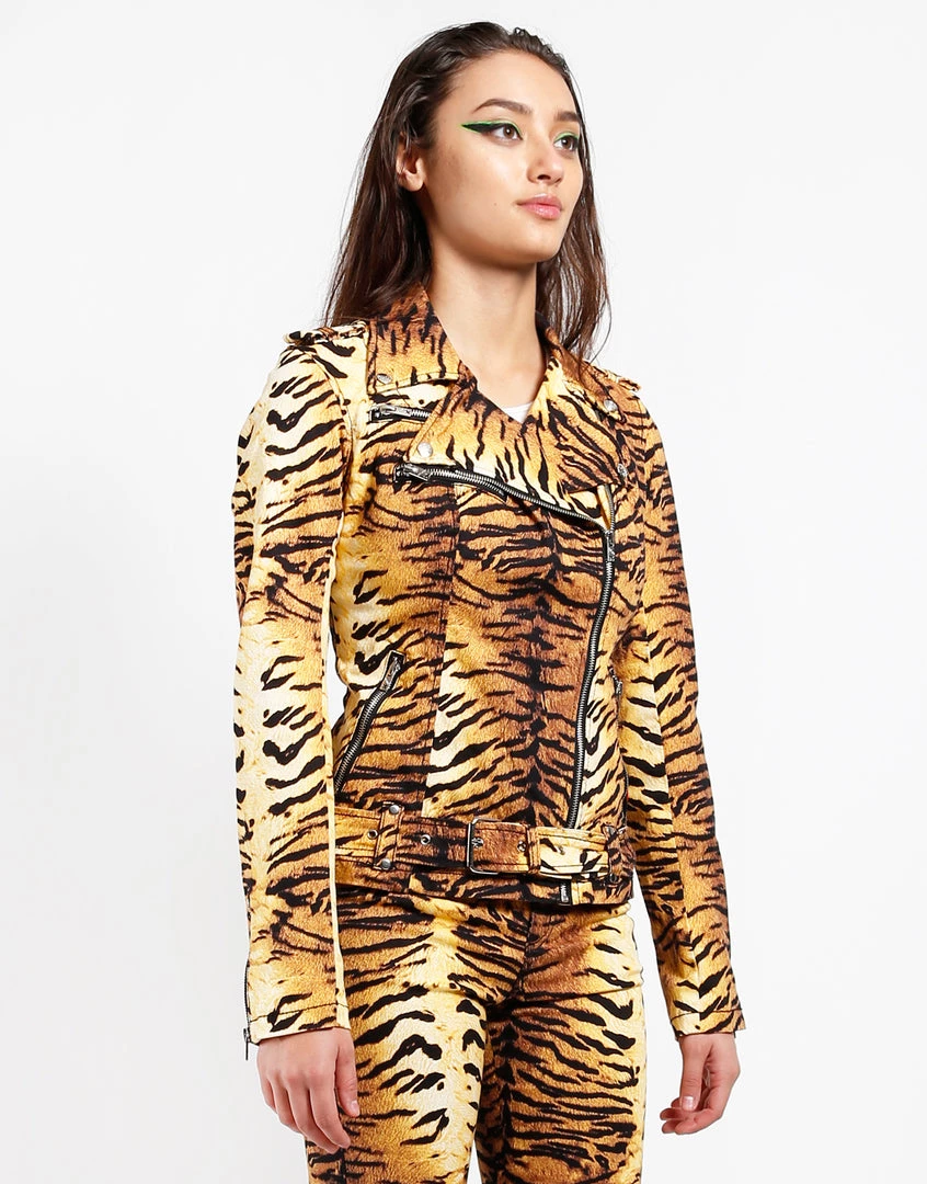 Get a little wild with your moto jacket in this tiger print version of the classic! This fitted jacket has moto detailing like zip front, pockets & sleeves, snap lapels and adjustable belt at the bottom.