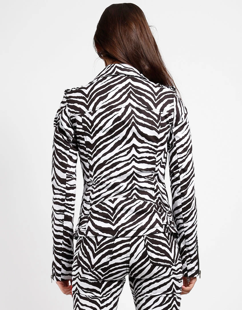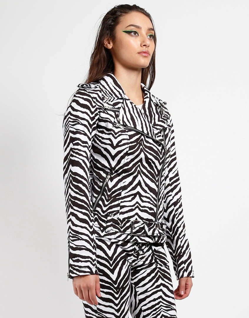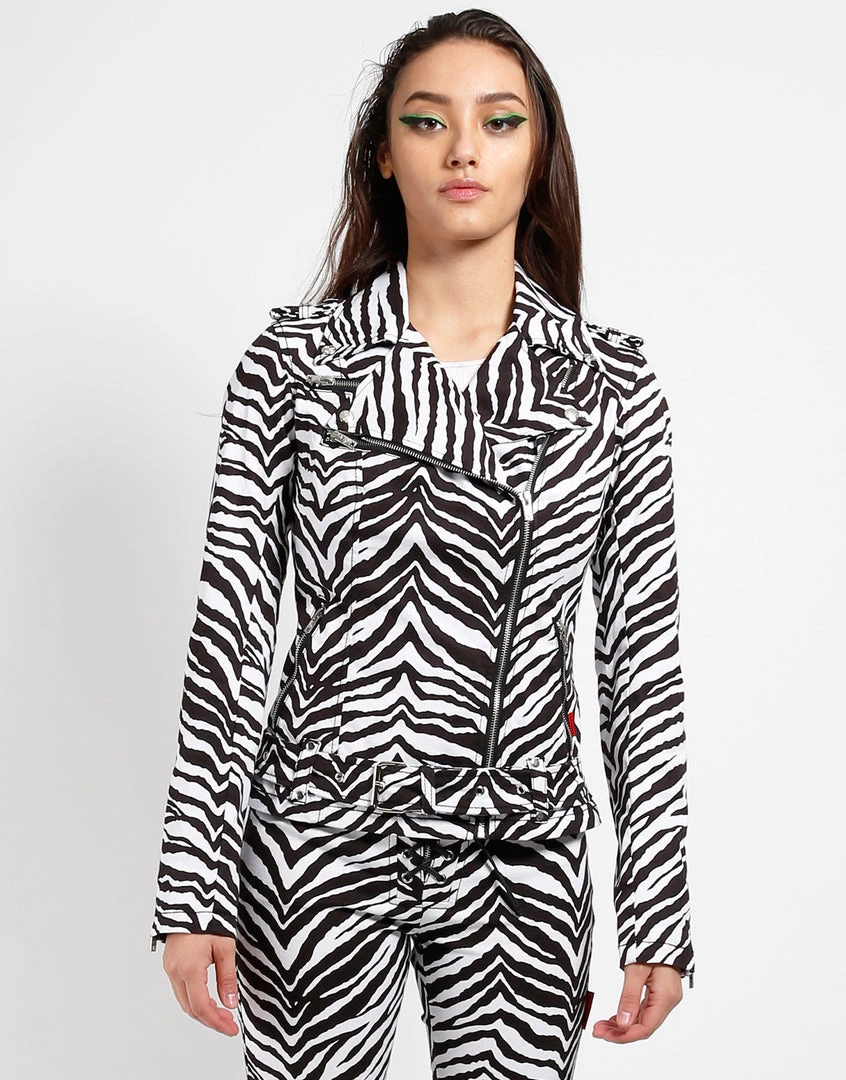 Get a little wild with your moto jacket in this zebra print version of the classic! This fitted jacket has moto detailing like zip front, pockets & sleeves, snap lapels and adjustable belt at the bottom.