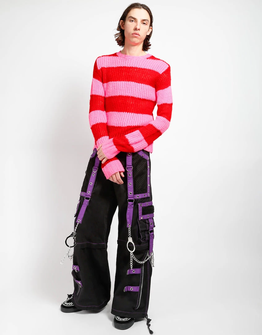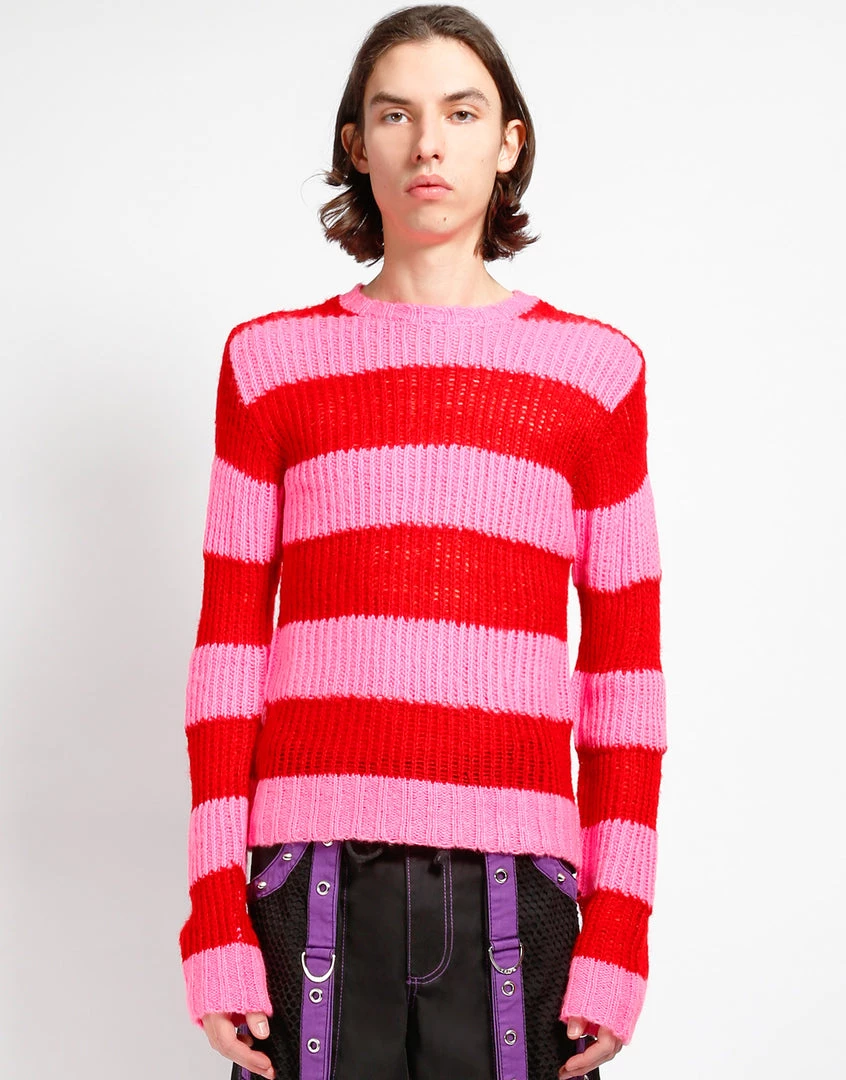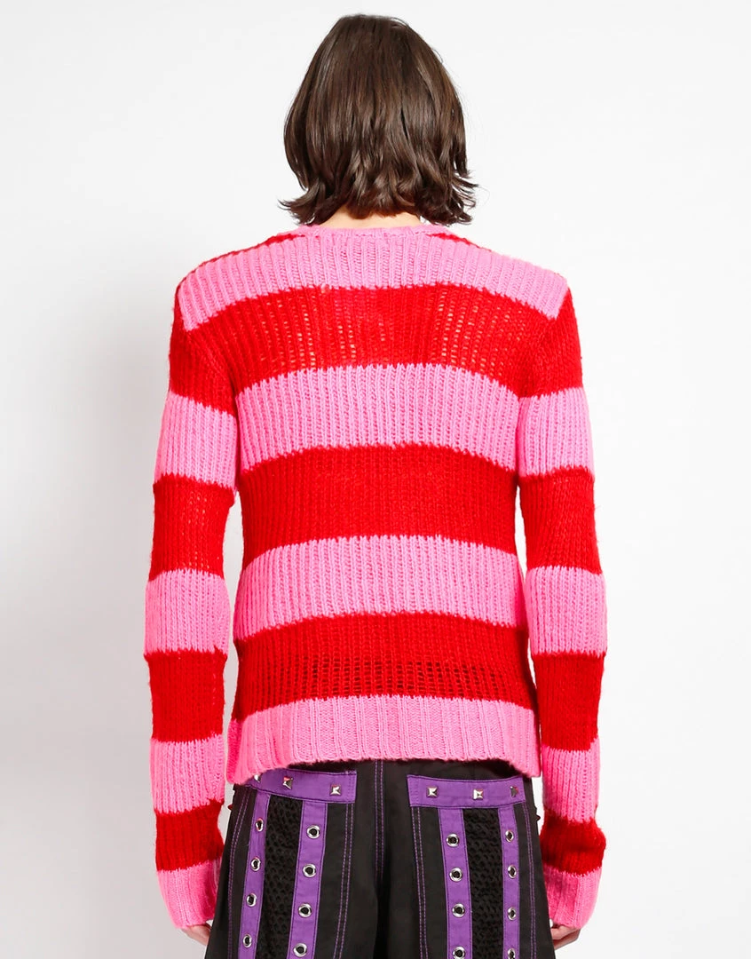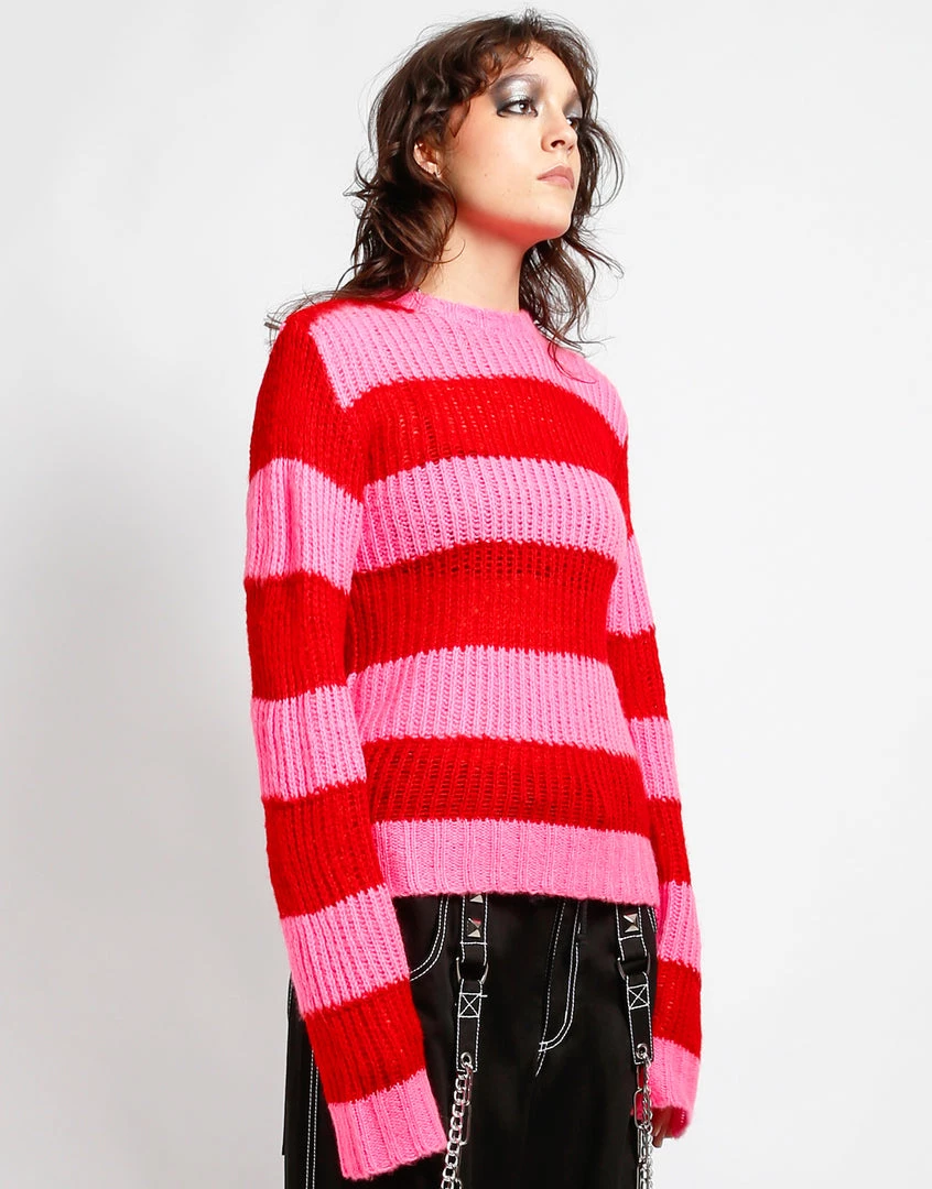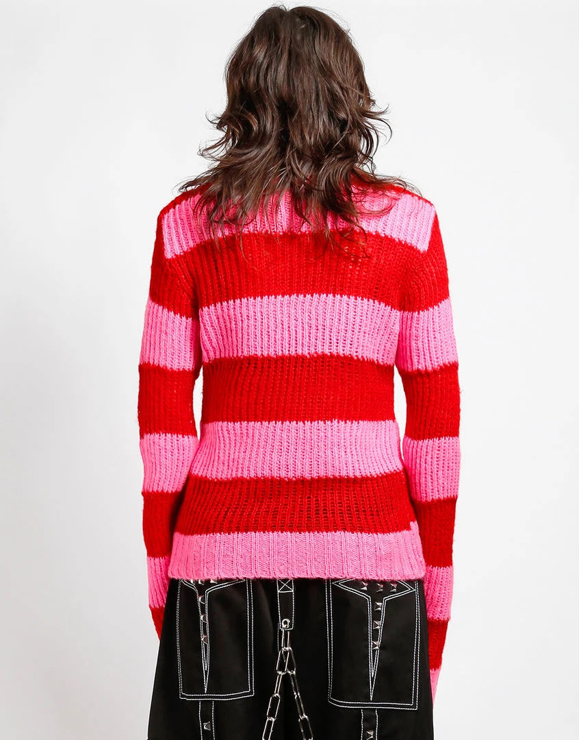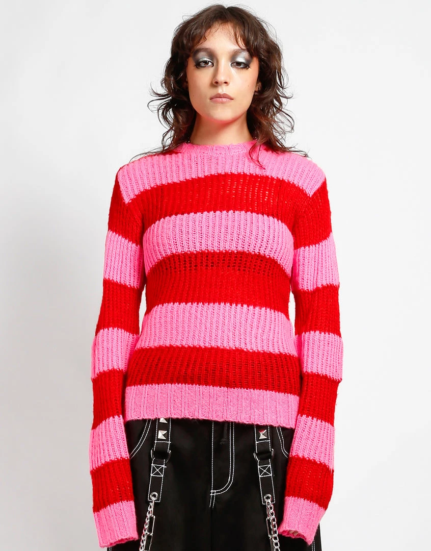 This red and pink stripe acrylic knit sweater features loose construction and long sleeves which means it looks perfectly lived in before you even put it on!