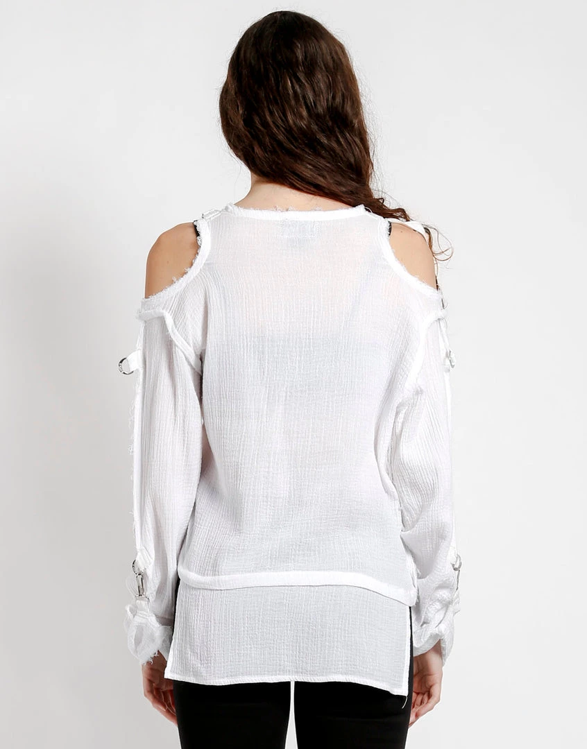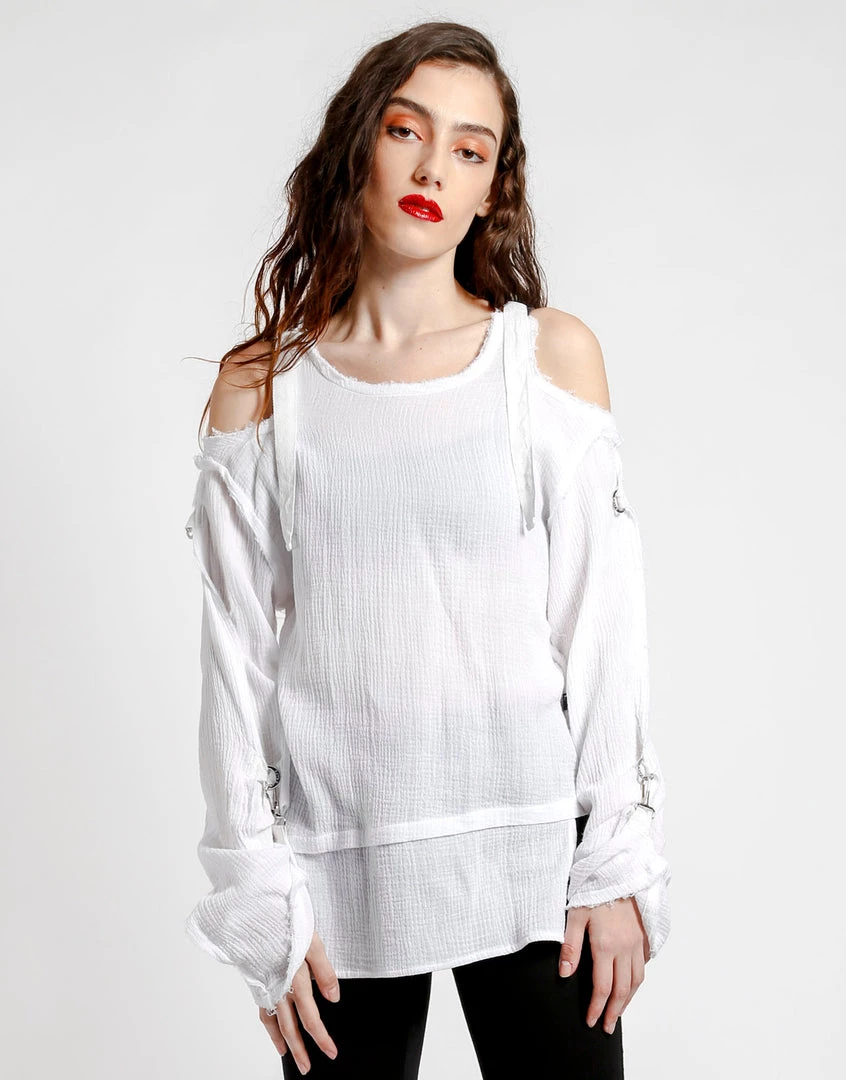 Wearing this tattered punk rock top proves you’ve got attitude and the style to match! This gauzy long sleeve has cutout shoulders with adjustable straps, fold over sleeves with a hook closure, d-ring details and dropped front & back.
