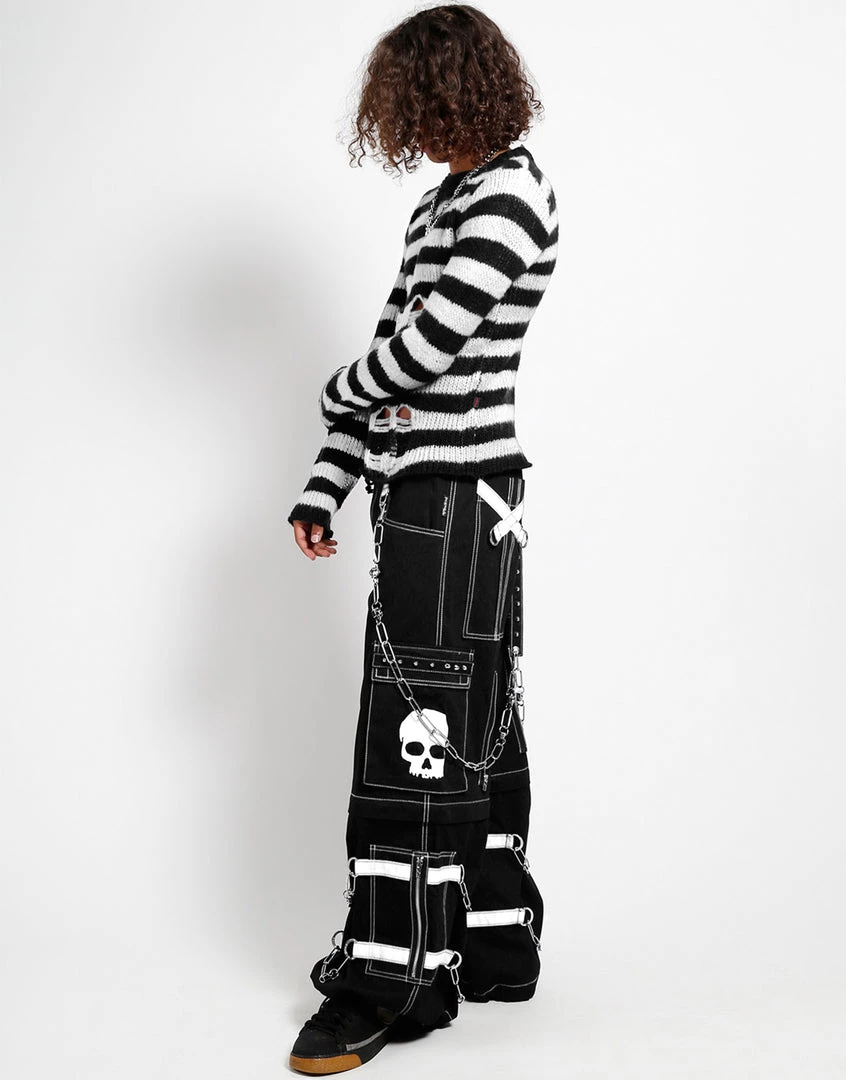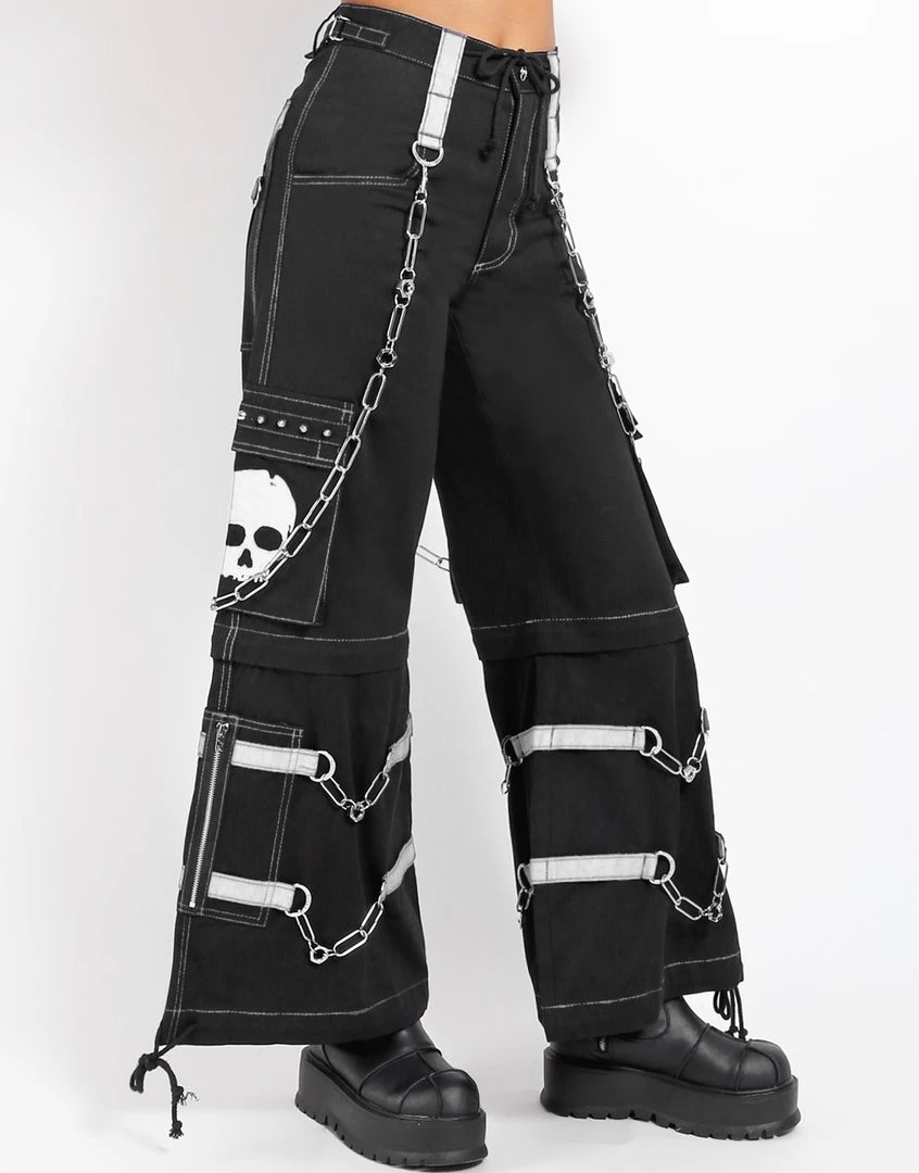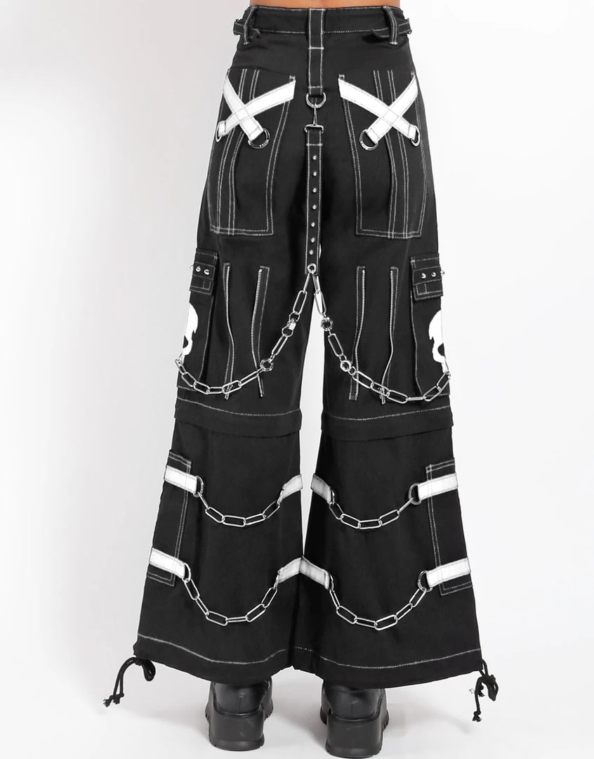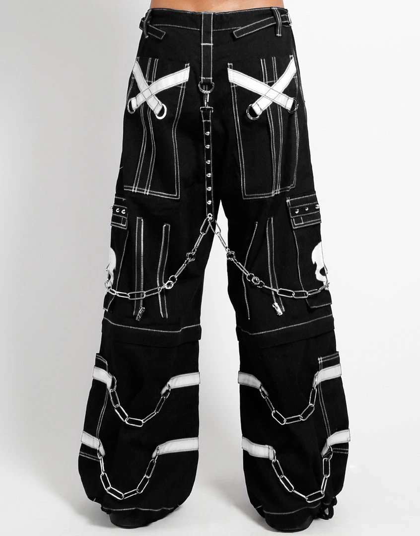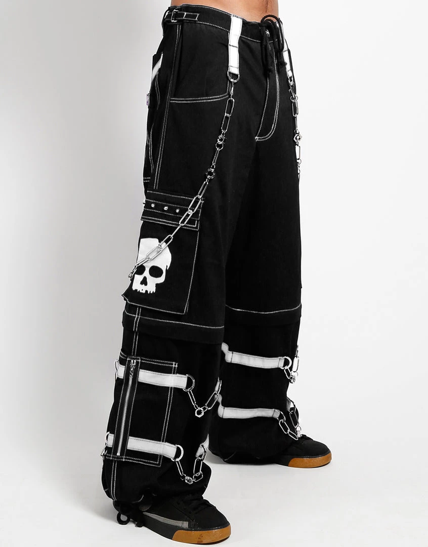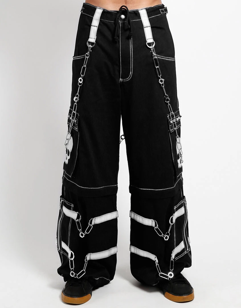 Accept no imitations! From the originator of all things DarkStreet, these studded skull embellished Black and White skull on the side pants zip off into shorts and feature removable chains, adjustable ankles, D-rings, and deep pockets.