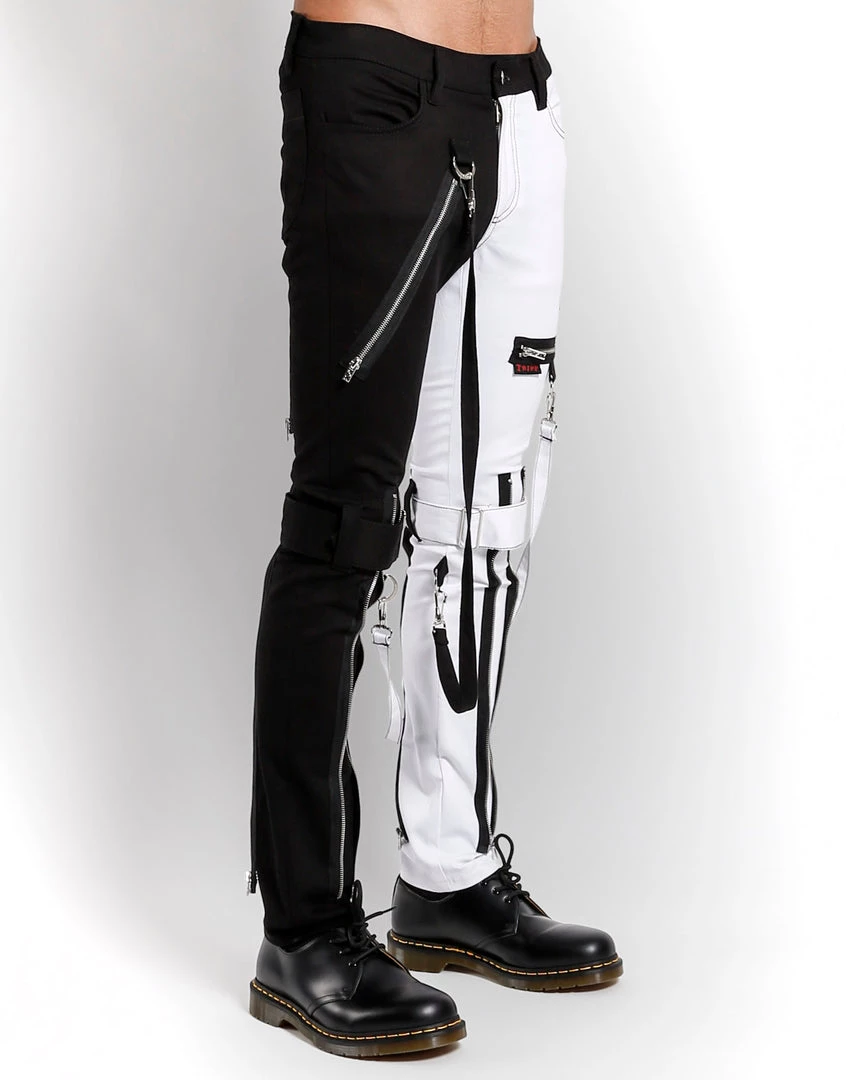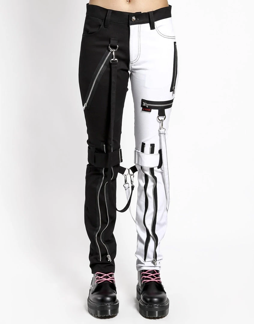 These pants were made for rocking out in. A punk rock wardrobe wouldn’t be complete without our classic slim split Black/White leg pants with removable bondage straps and zipper details. Pant legs can be zipped for a change in fit, topped off with a zip fly and button closure.