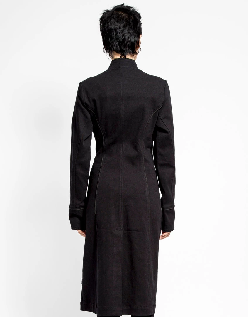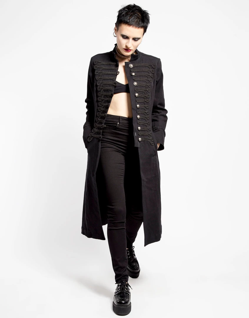March to your own beat! Knee length trench with braiding details, side pockets & button closure.